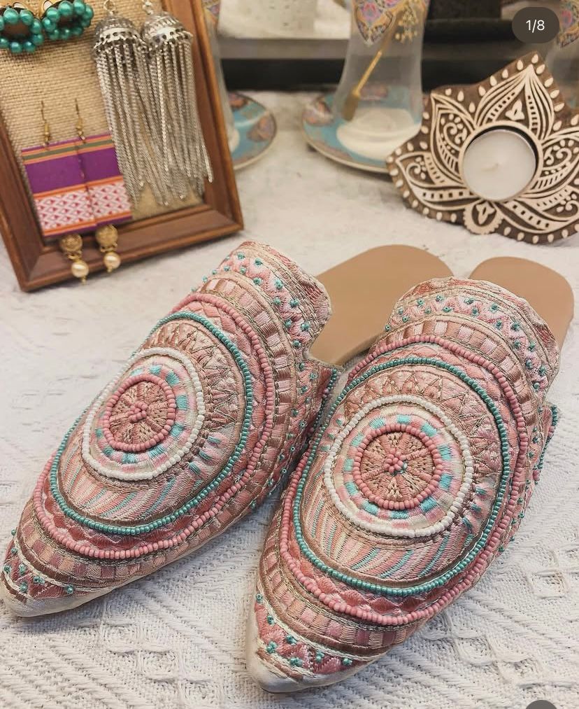 粉紅白色珠珠配刺繡平底Jutti鞋