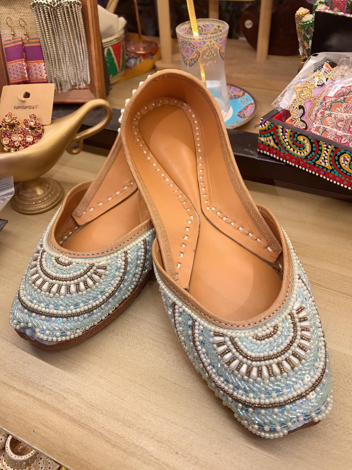 粉藍白色珠珠配刺繡平底Jutti鞋