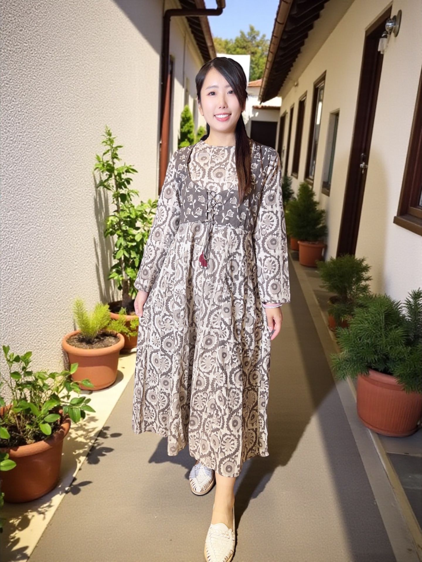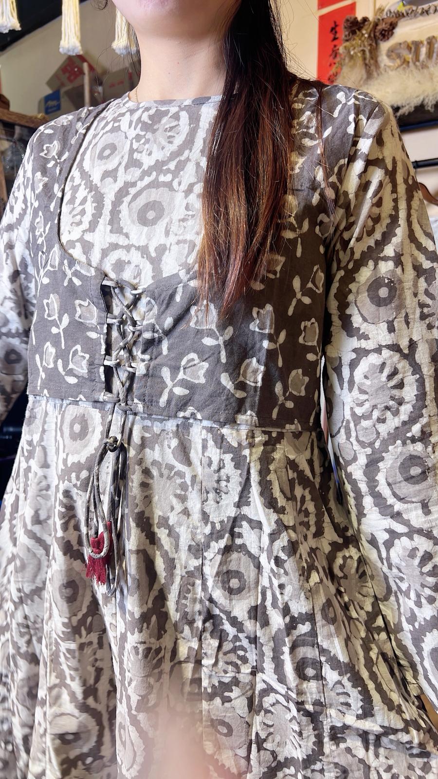 啡灰色圓領Block Print印花假兩件長袖連身裙
