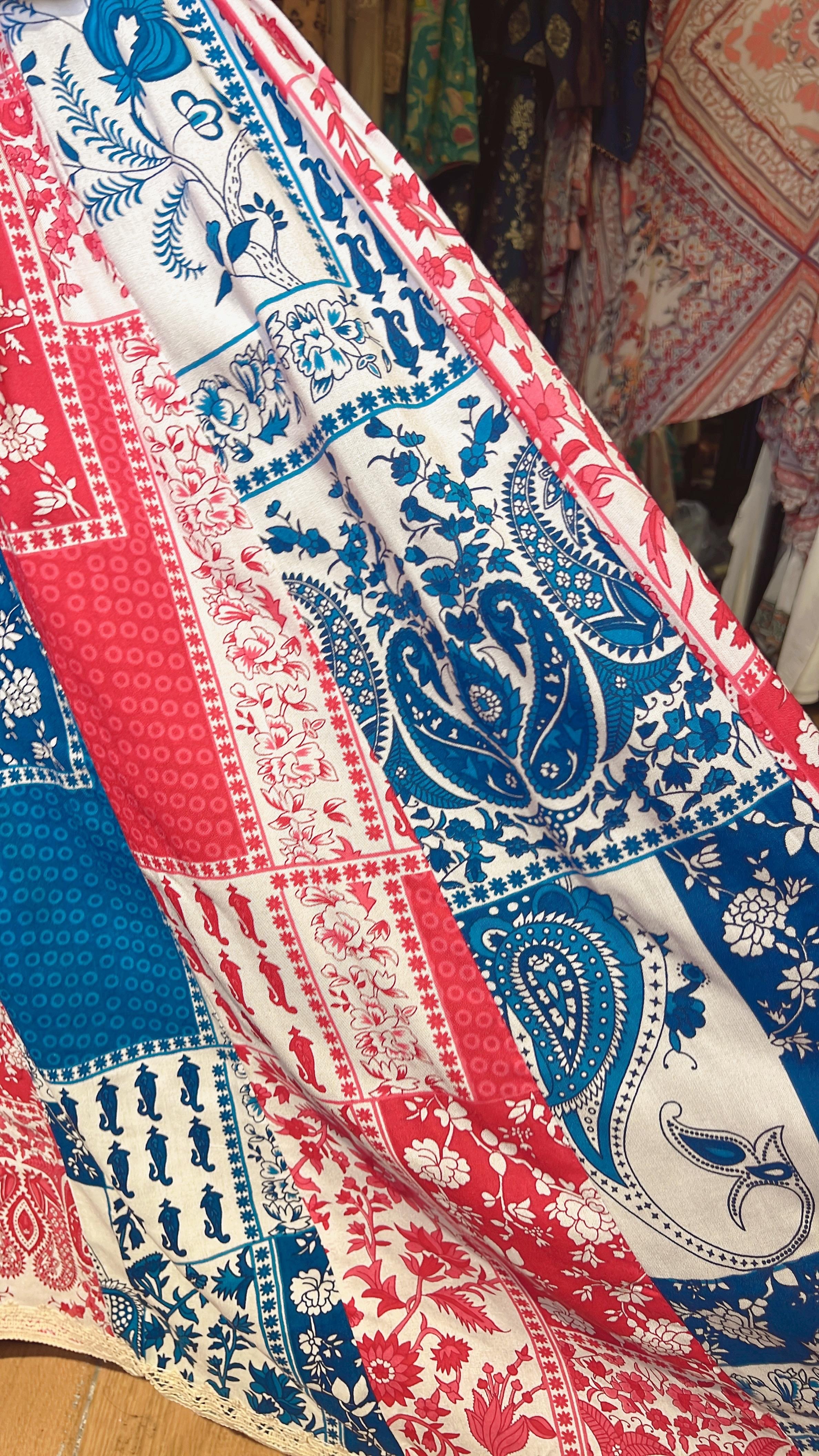 啡紅色併布復古印花半截裙
