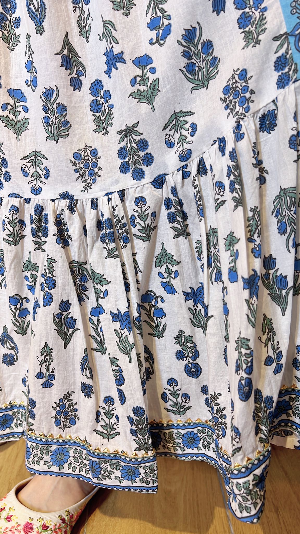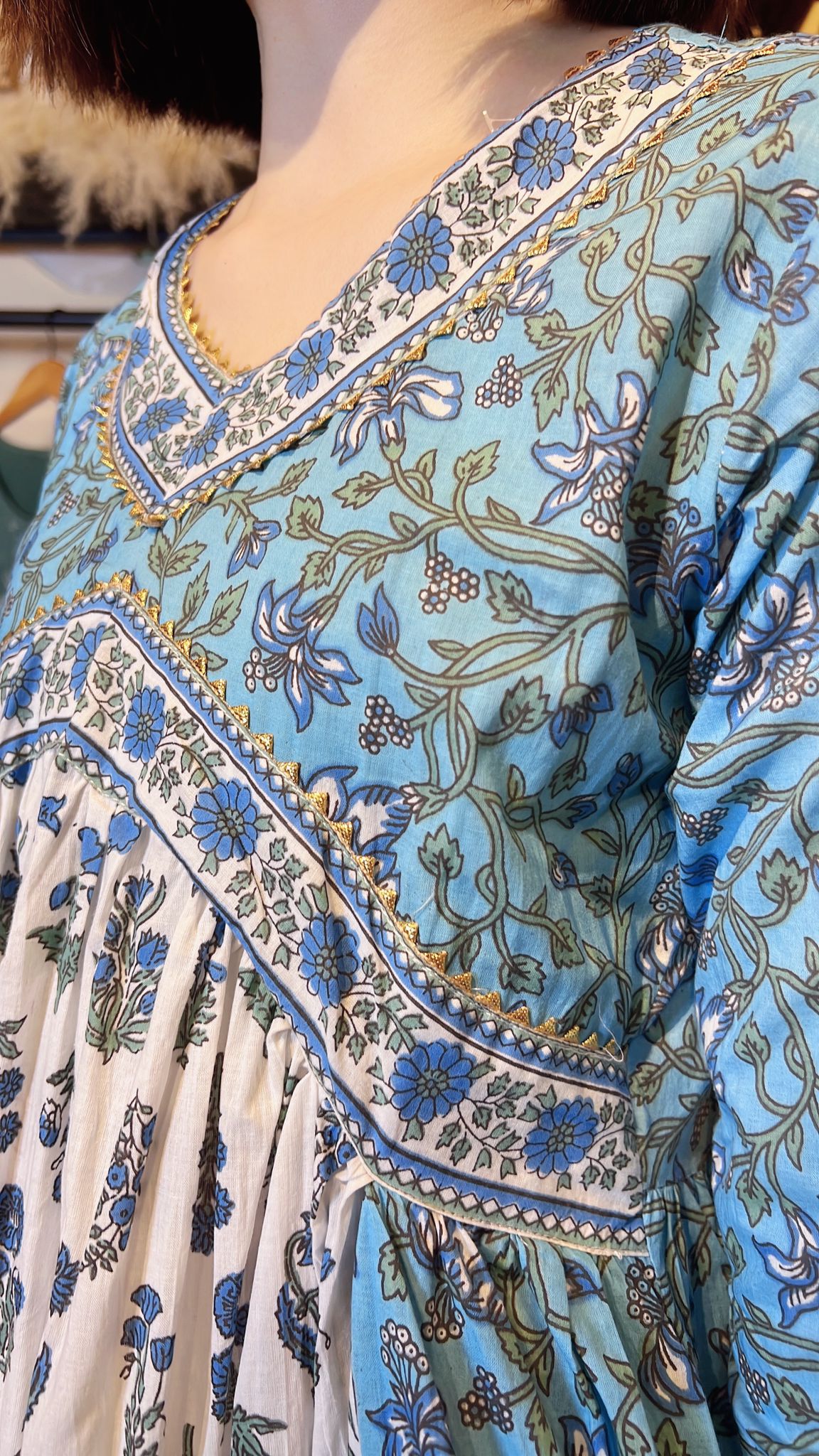 天空藍白色對V金線Block Print印花娃娃款連身裙