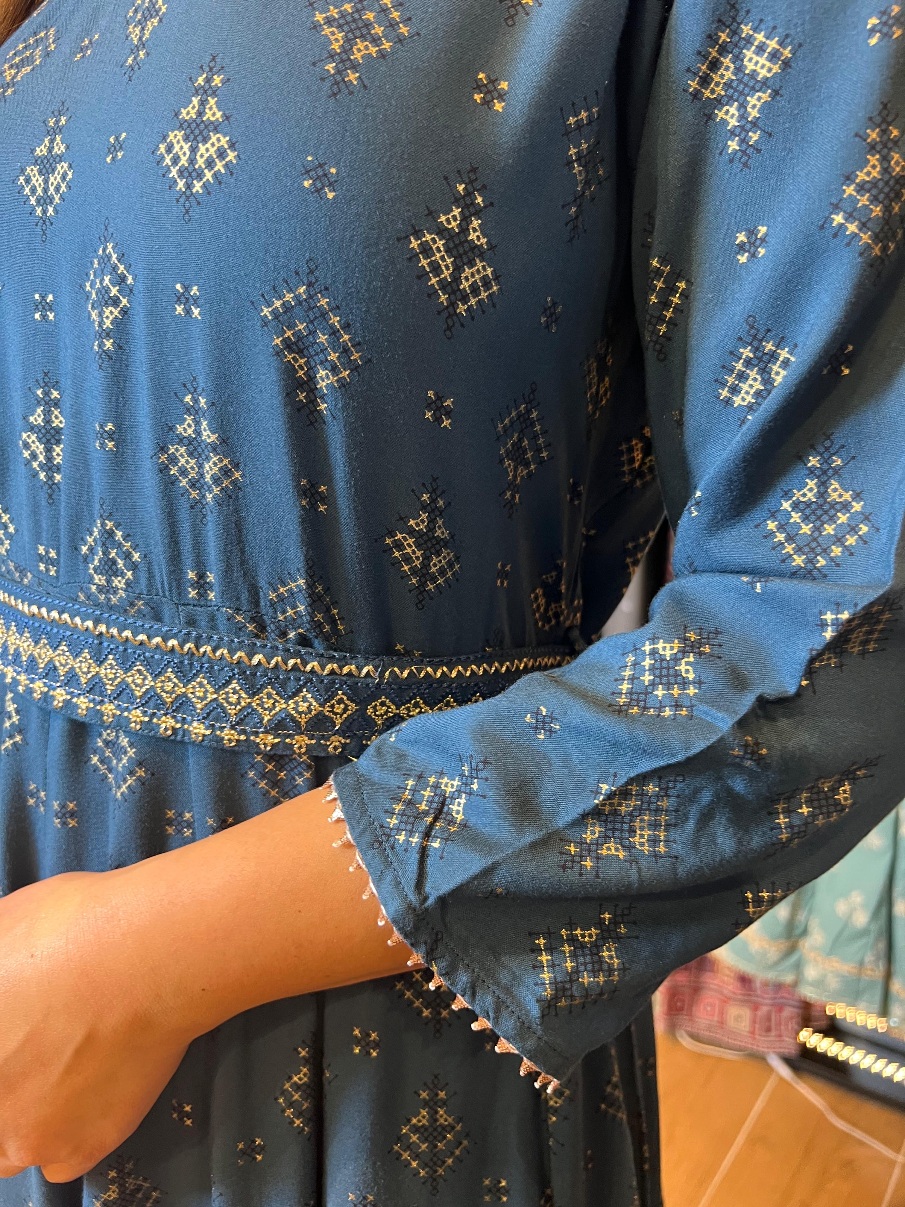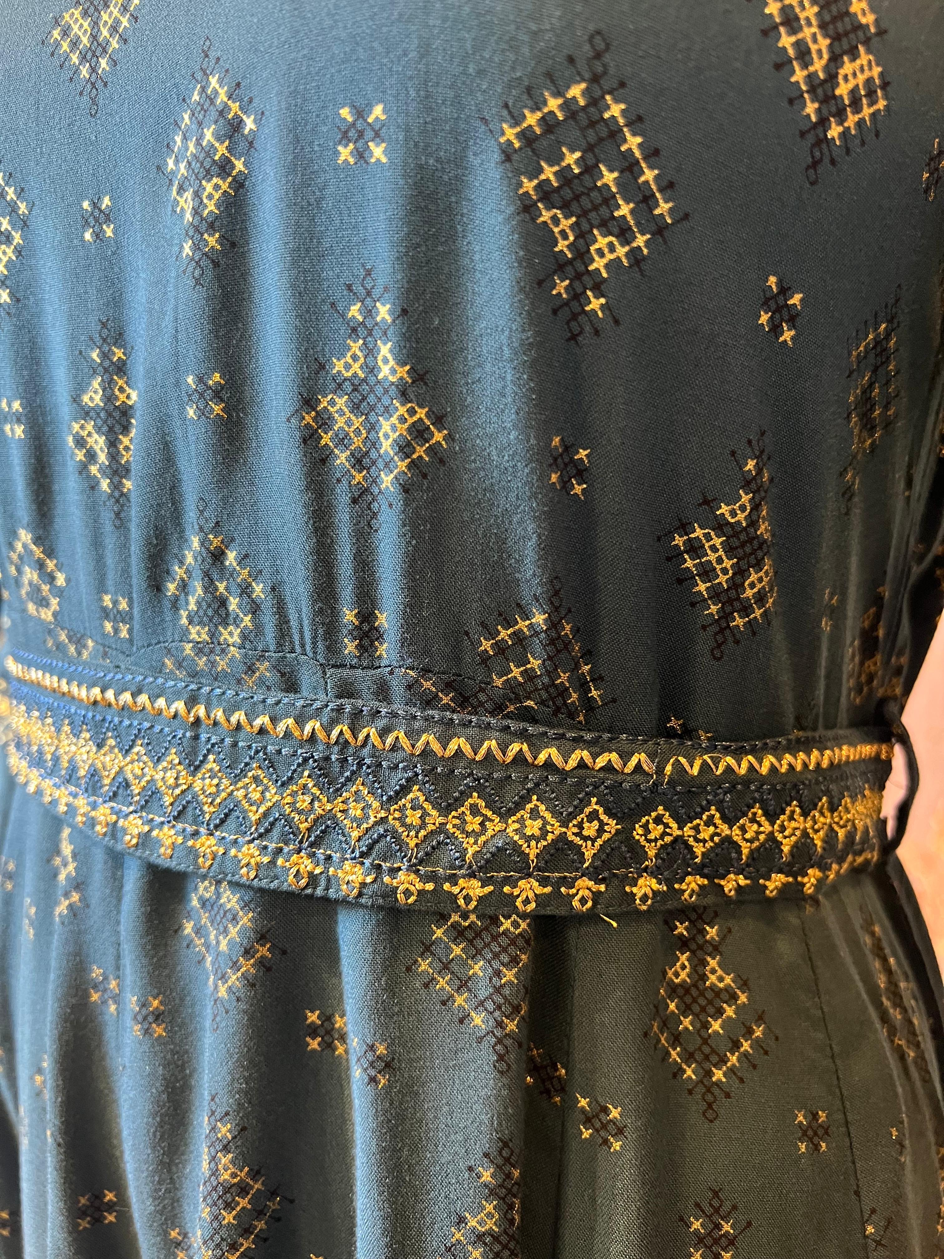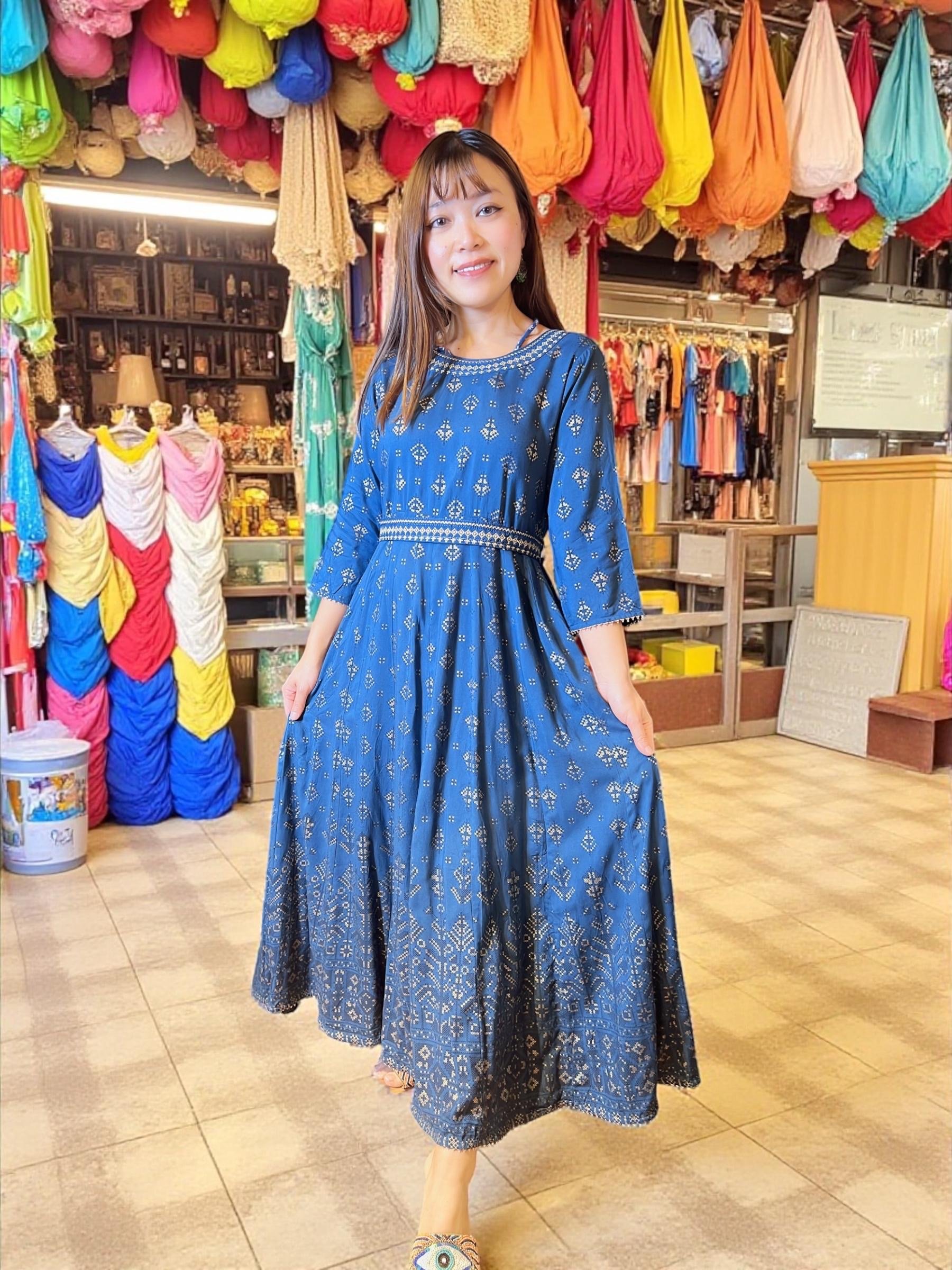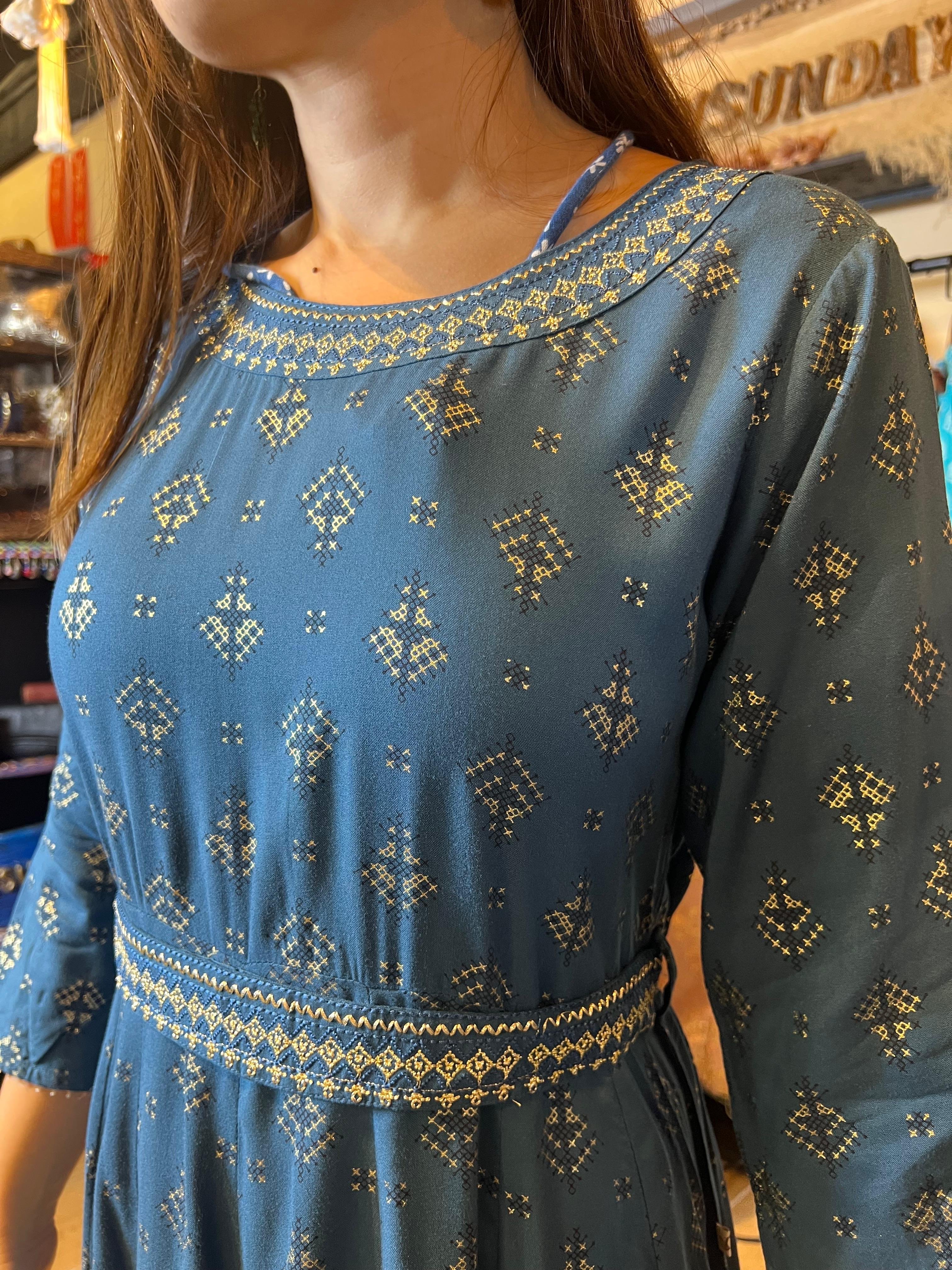 寶藍色圓領刺繡印花連刺繡腰帶中袖連身裙