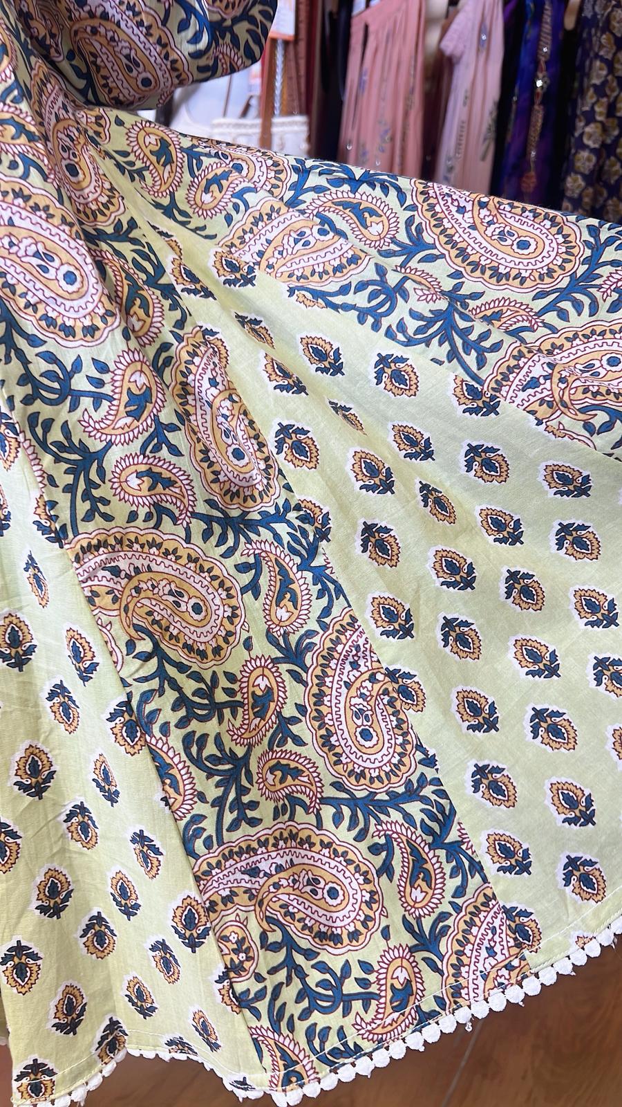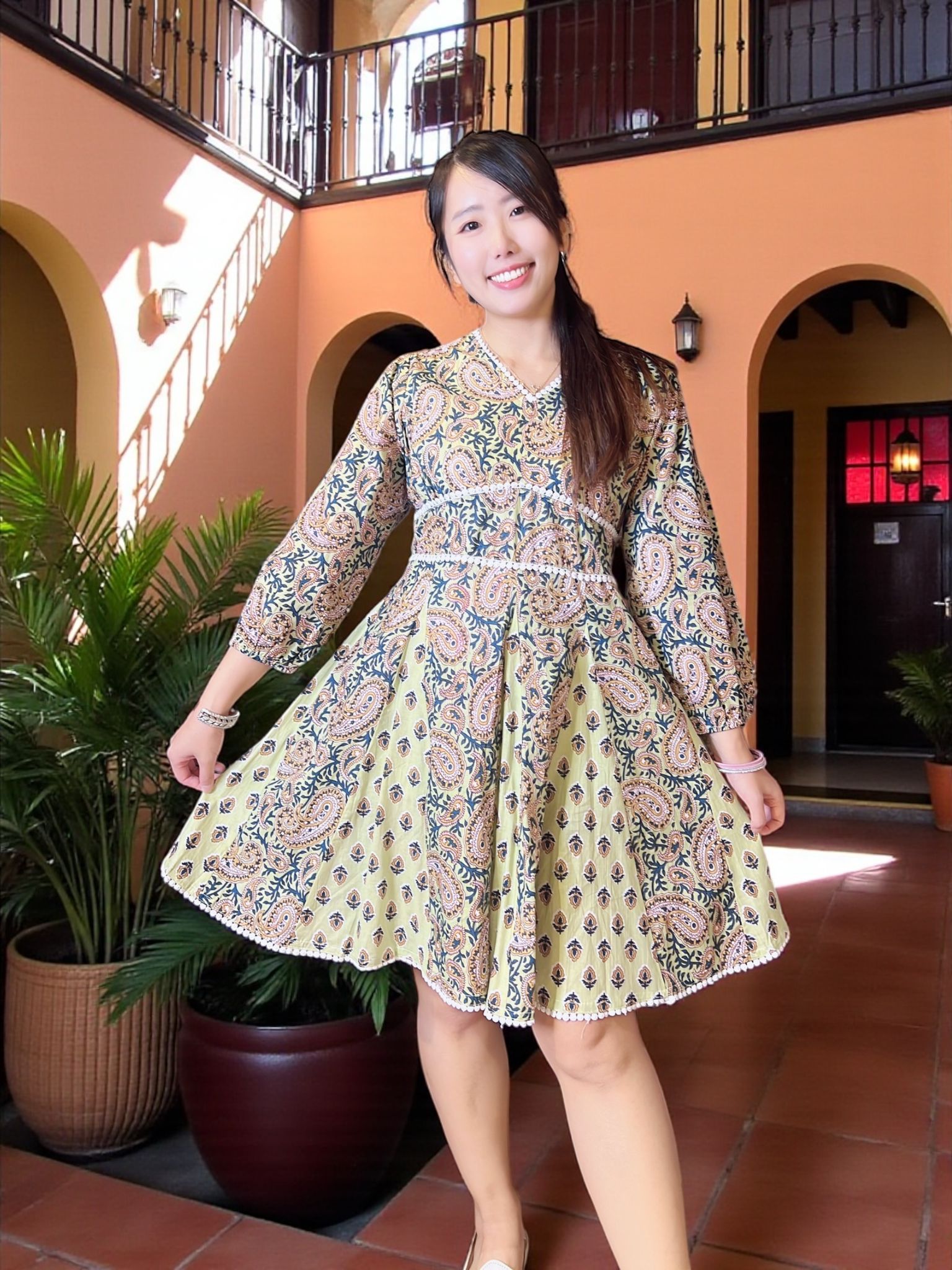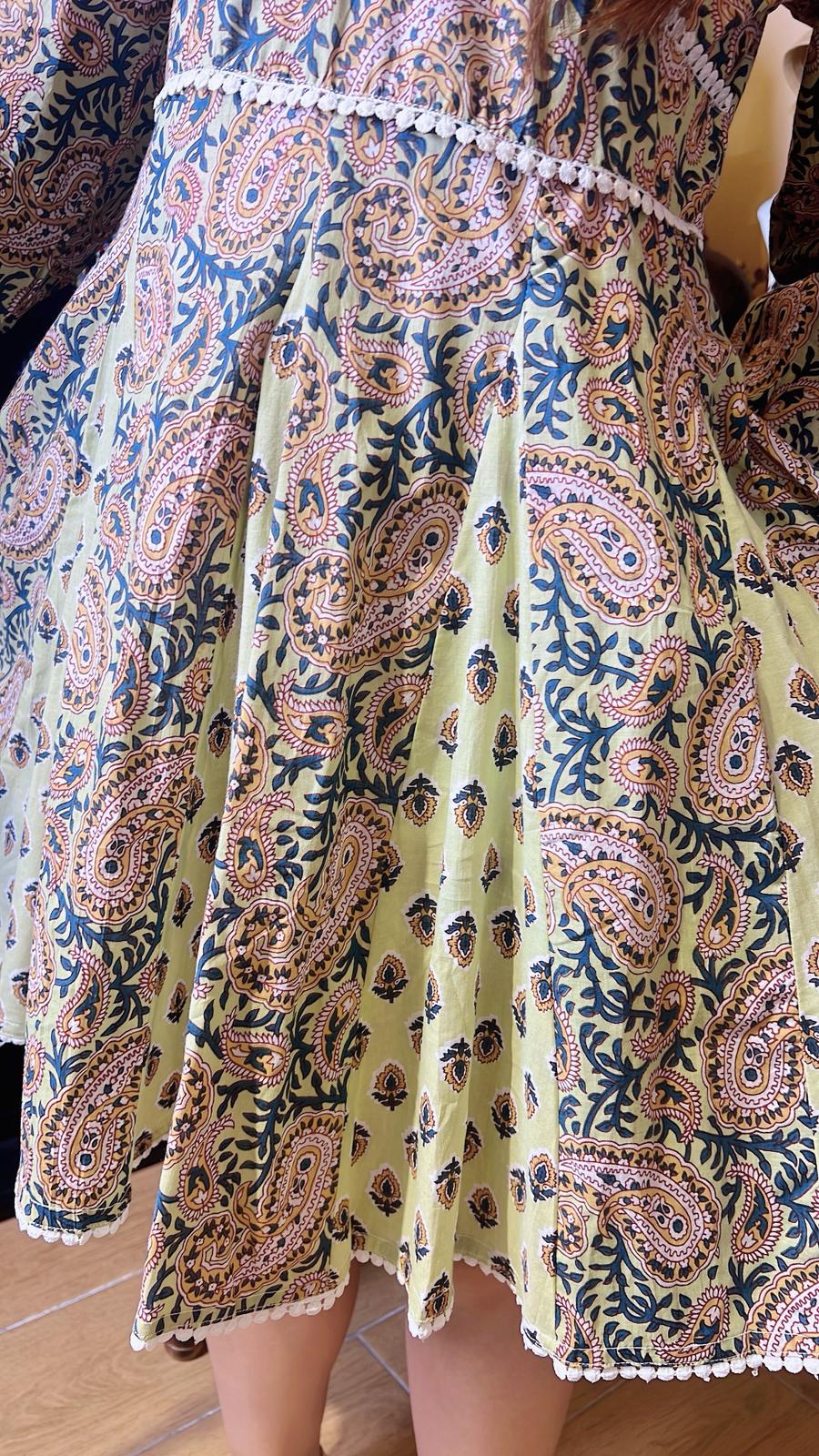 淡綠黃色腰果印花併布短版連身裙