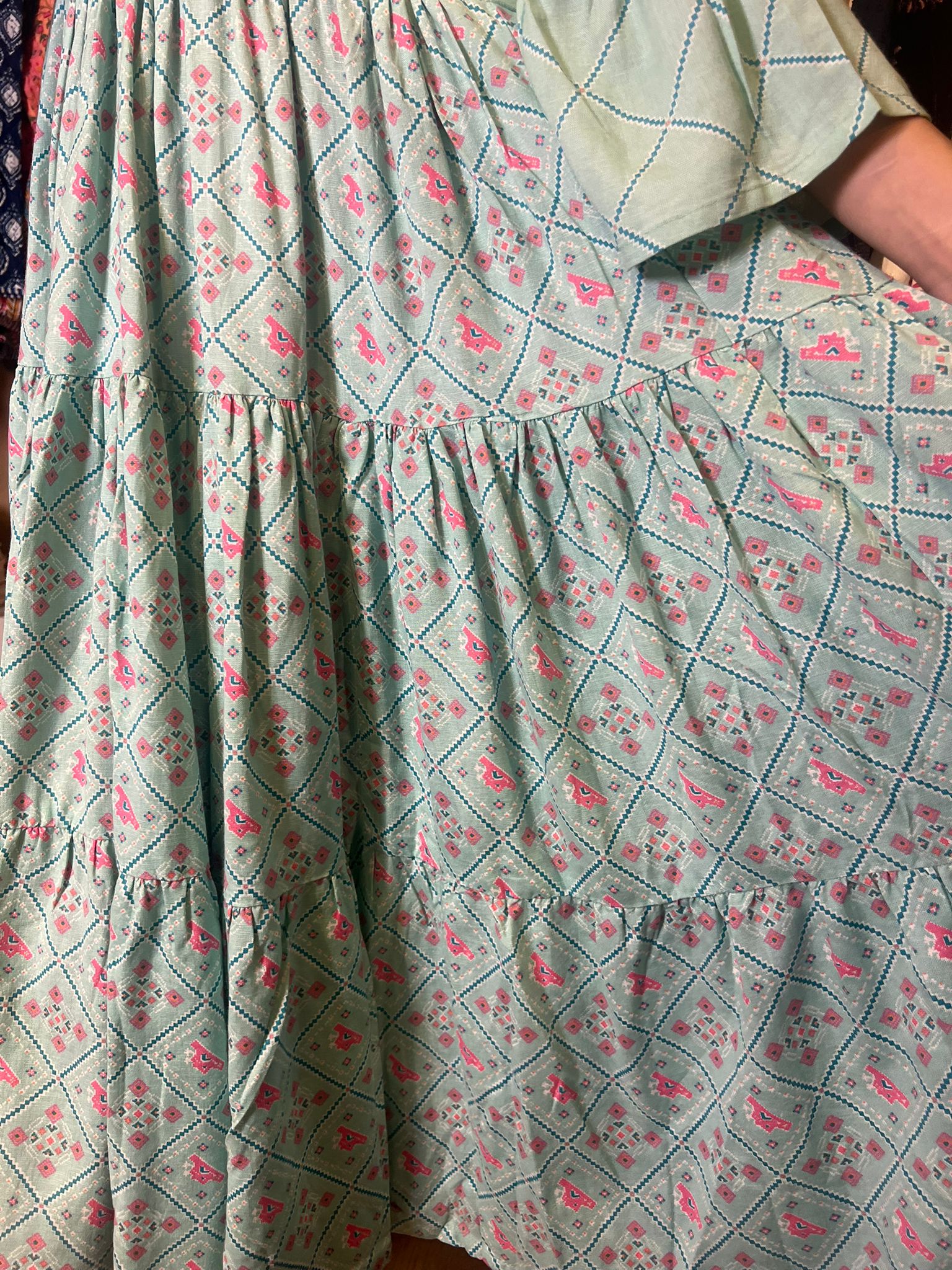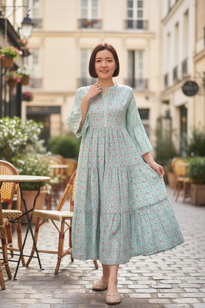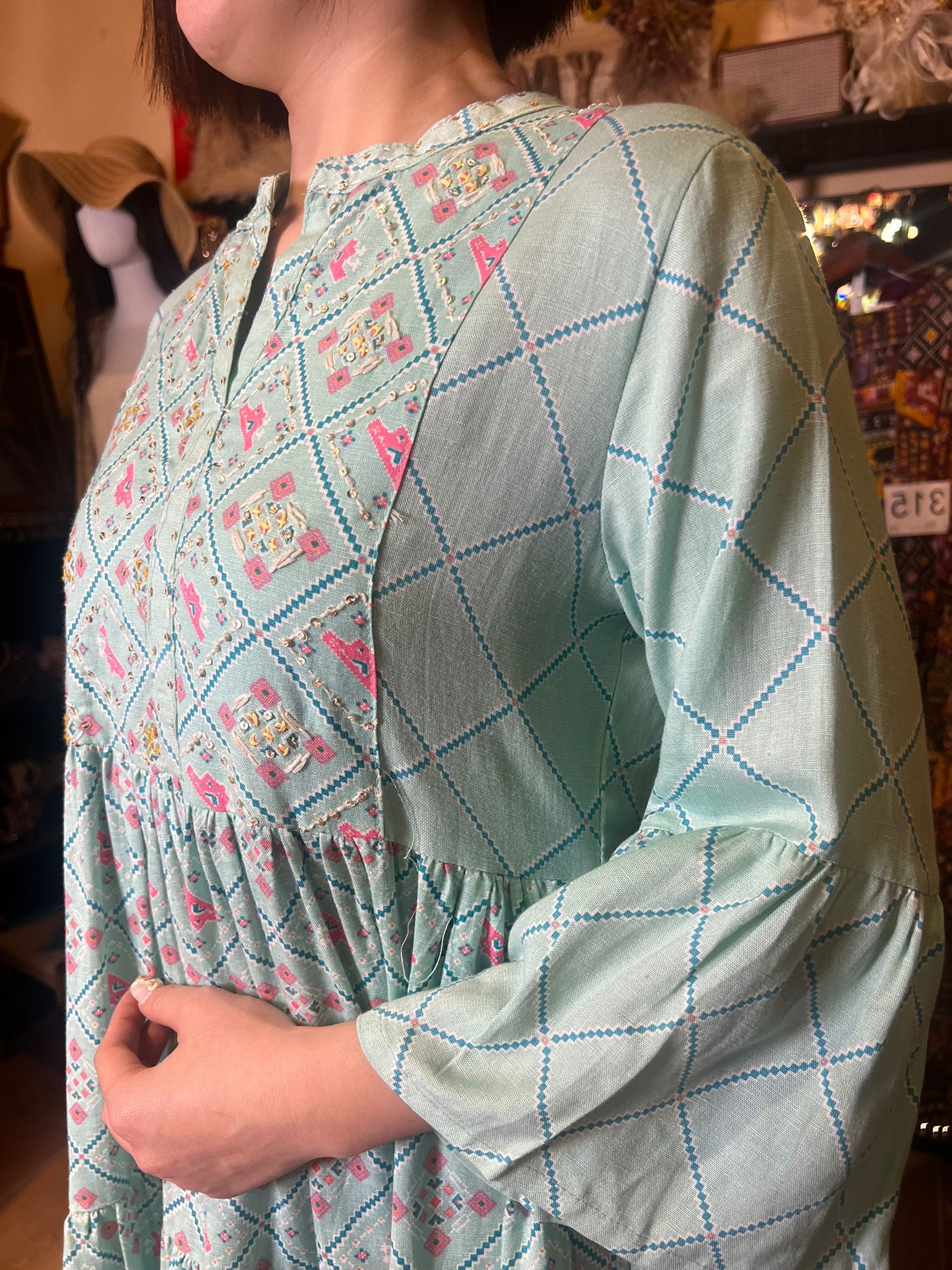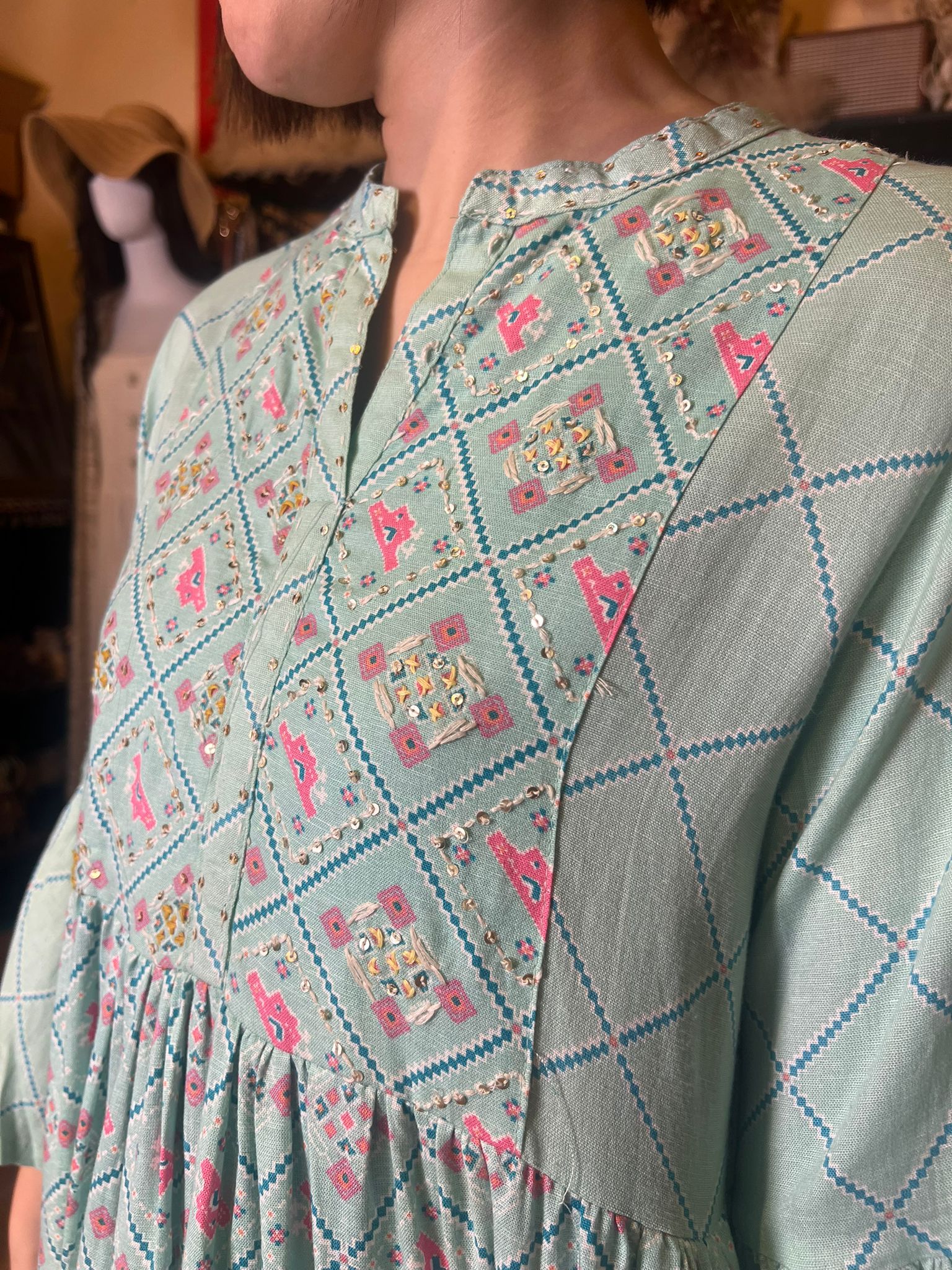 湖水綠色V領印花刺繡喇叭袖連身裙