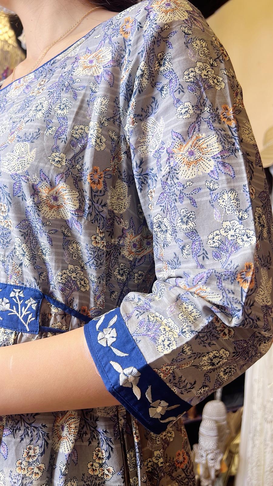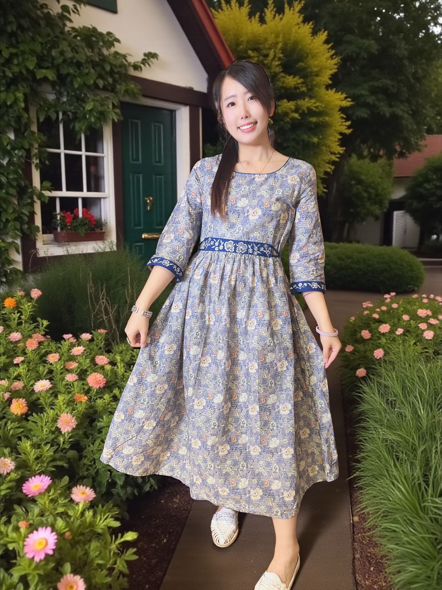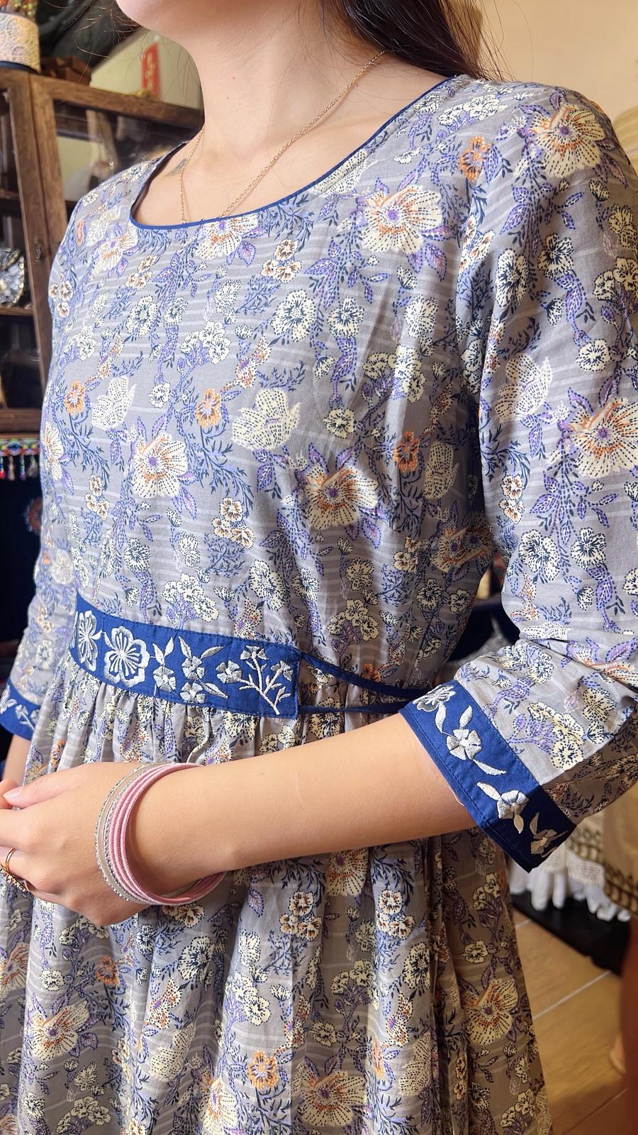 灰紫色圓領Block Print印花刺繡邊中袖連身裙