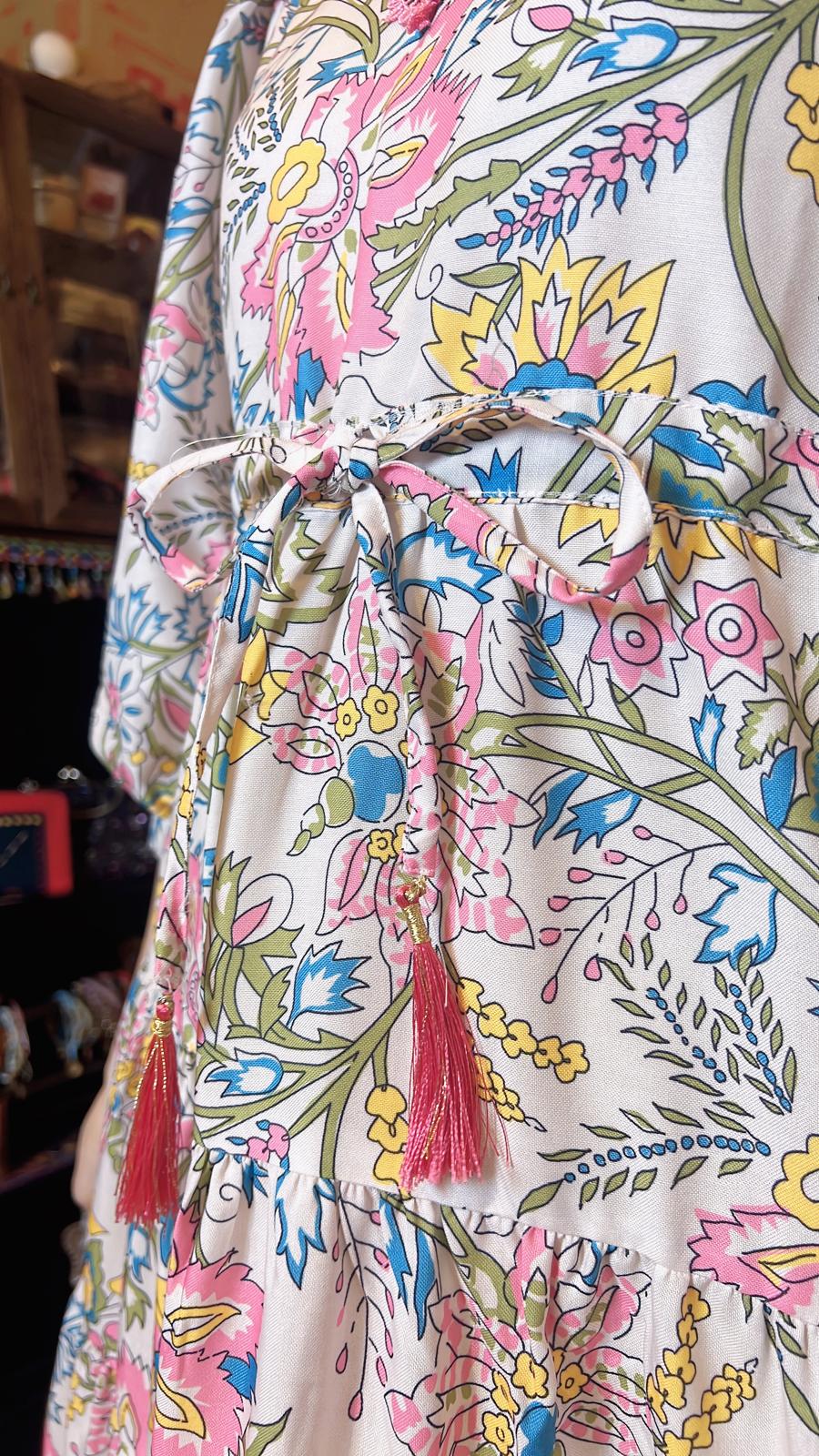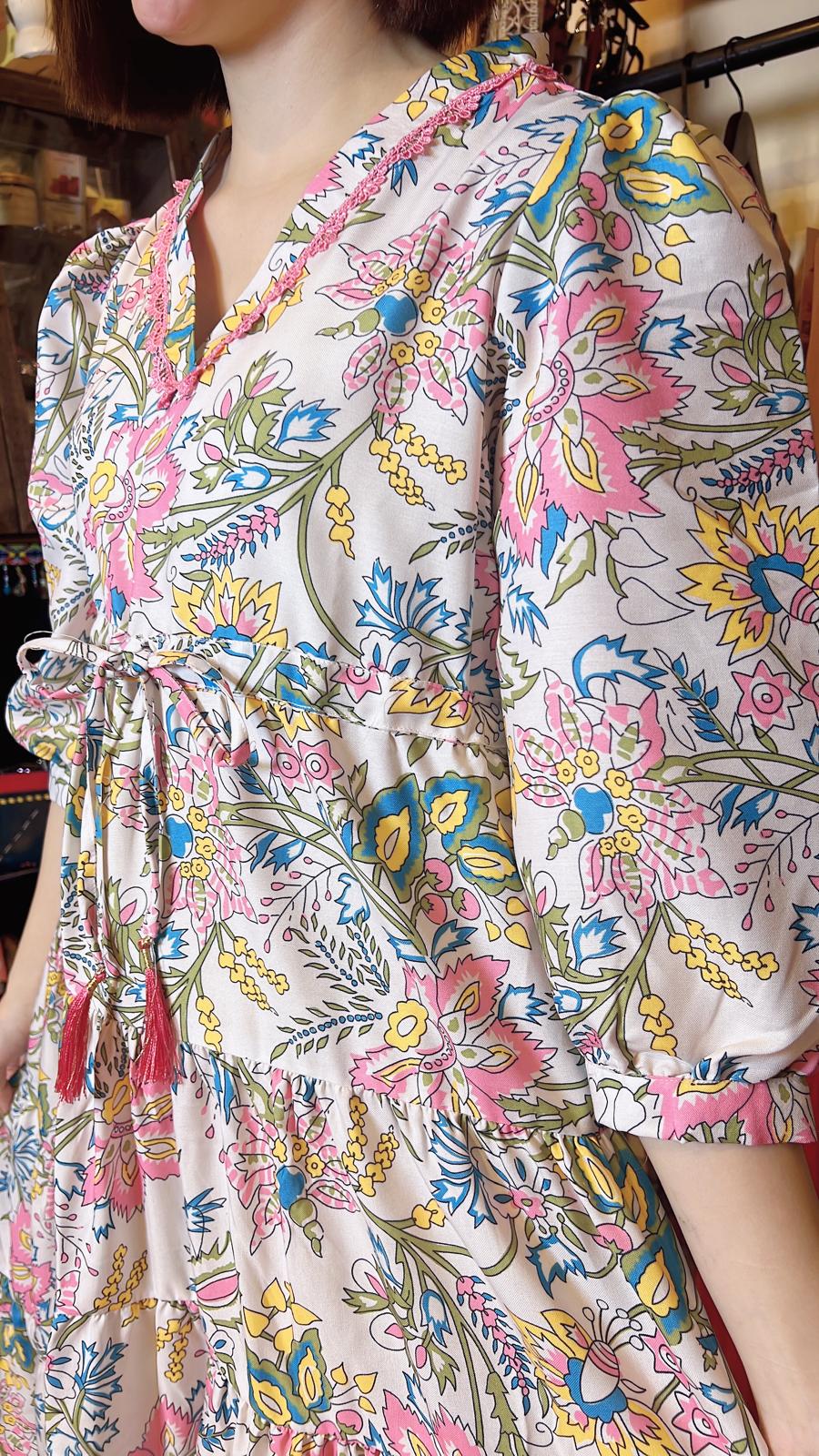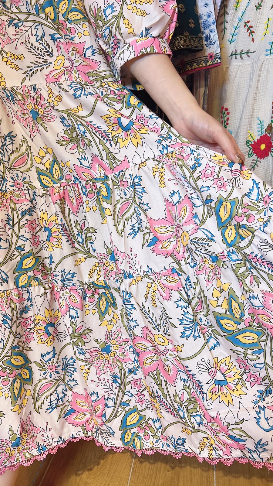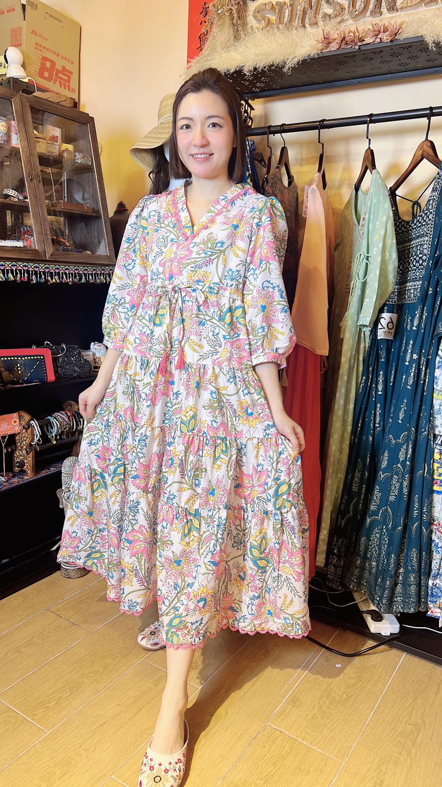 白色底V領Block Print粉色印花中袖三層蛋糕連身裙