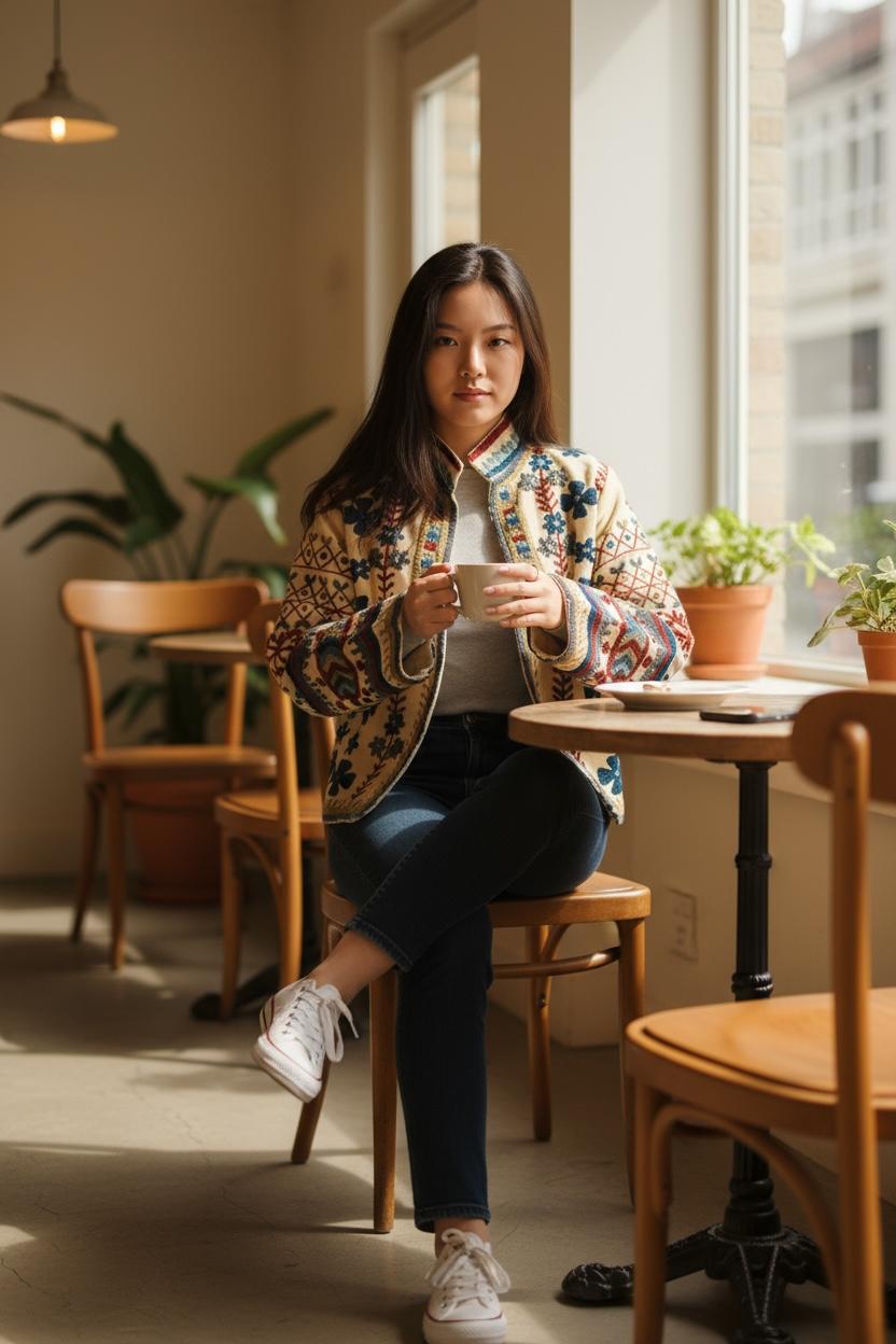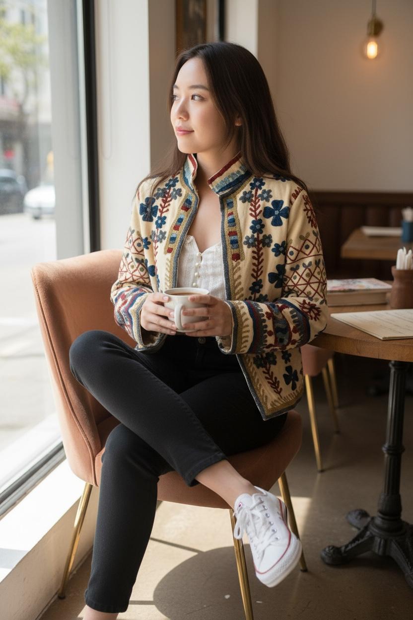 米白色底企領併植物重工刺繡外套