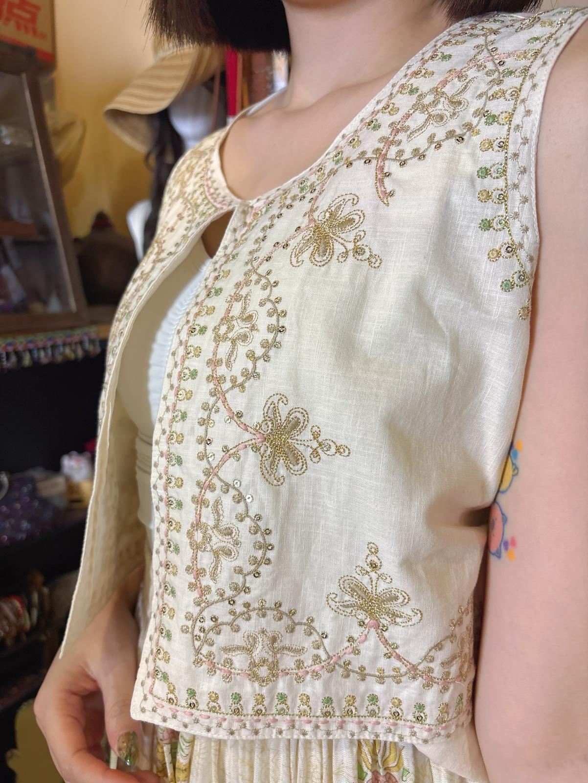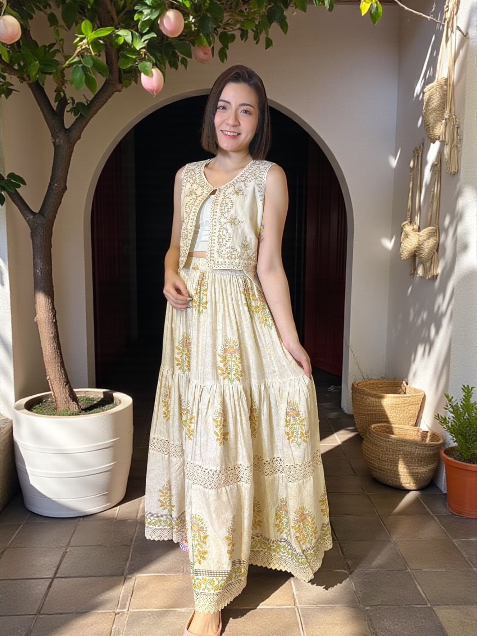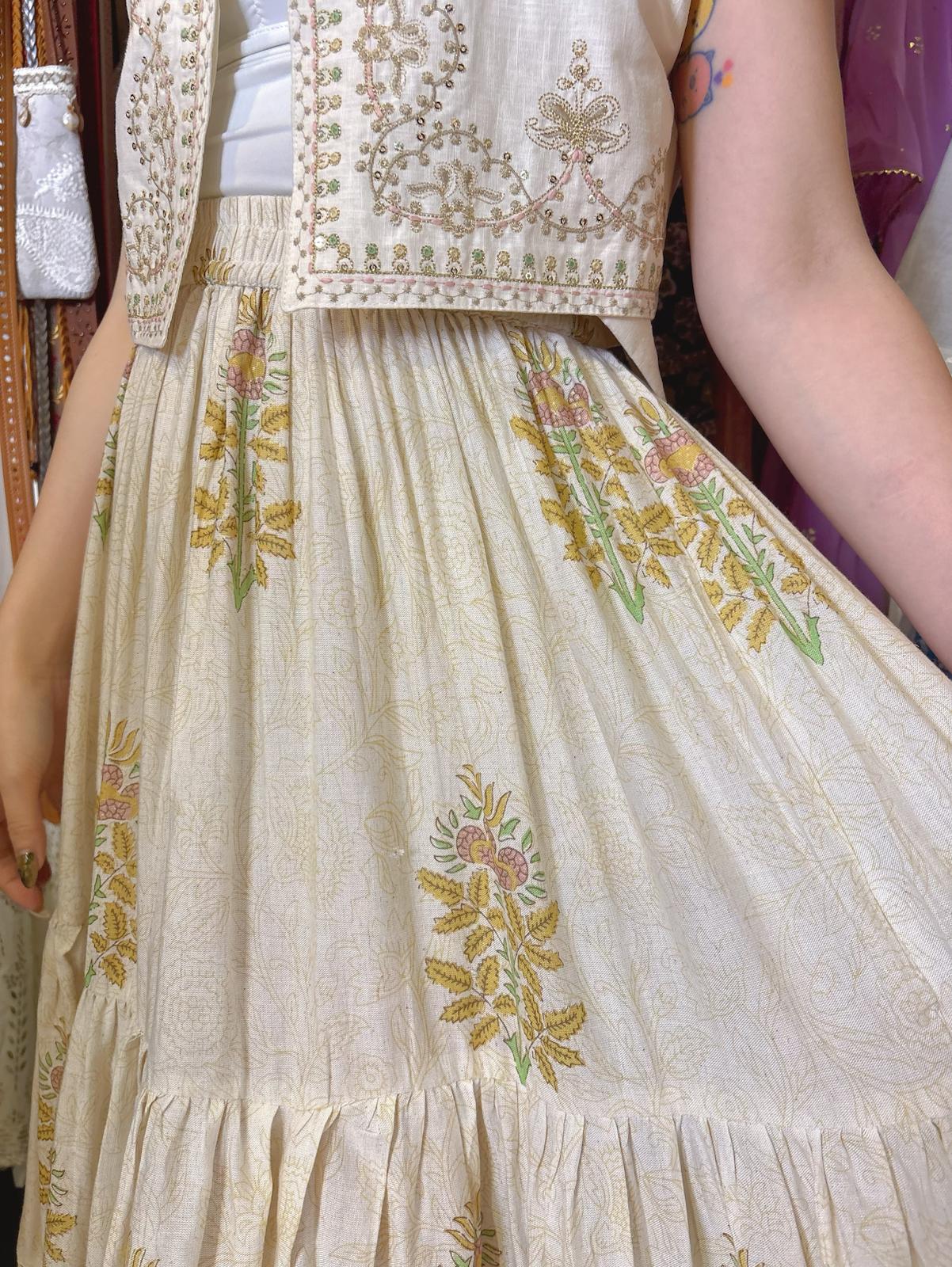 米黃色印花半截裙配重工刺繡背心馬甲一套兩件