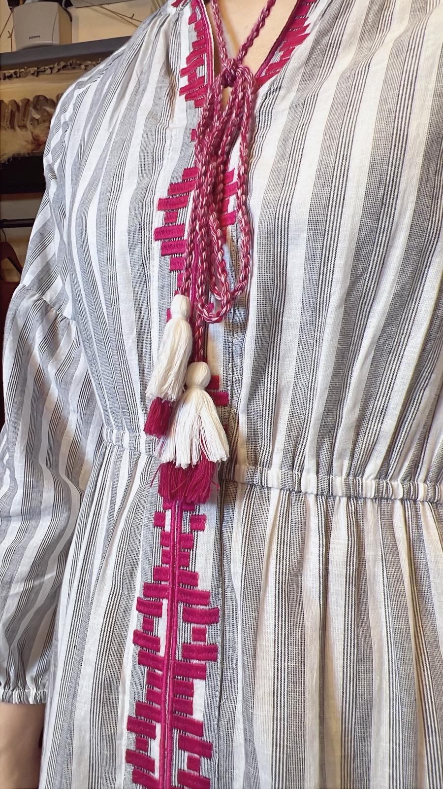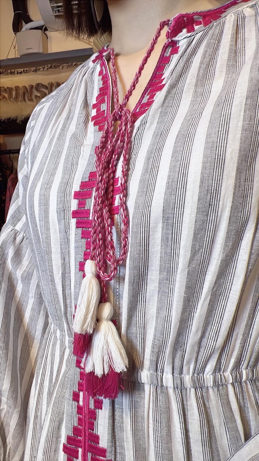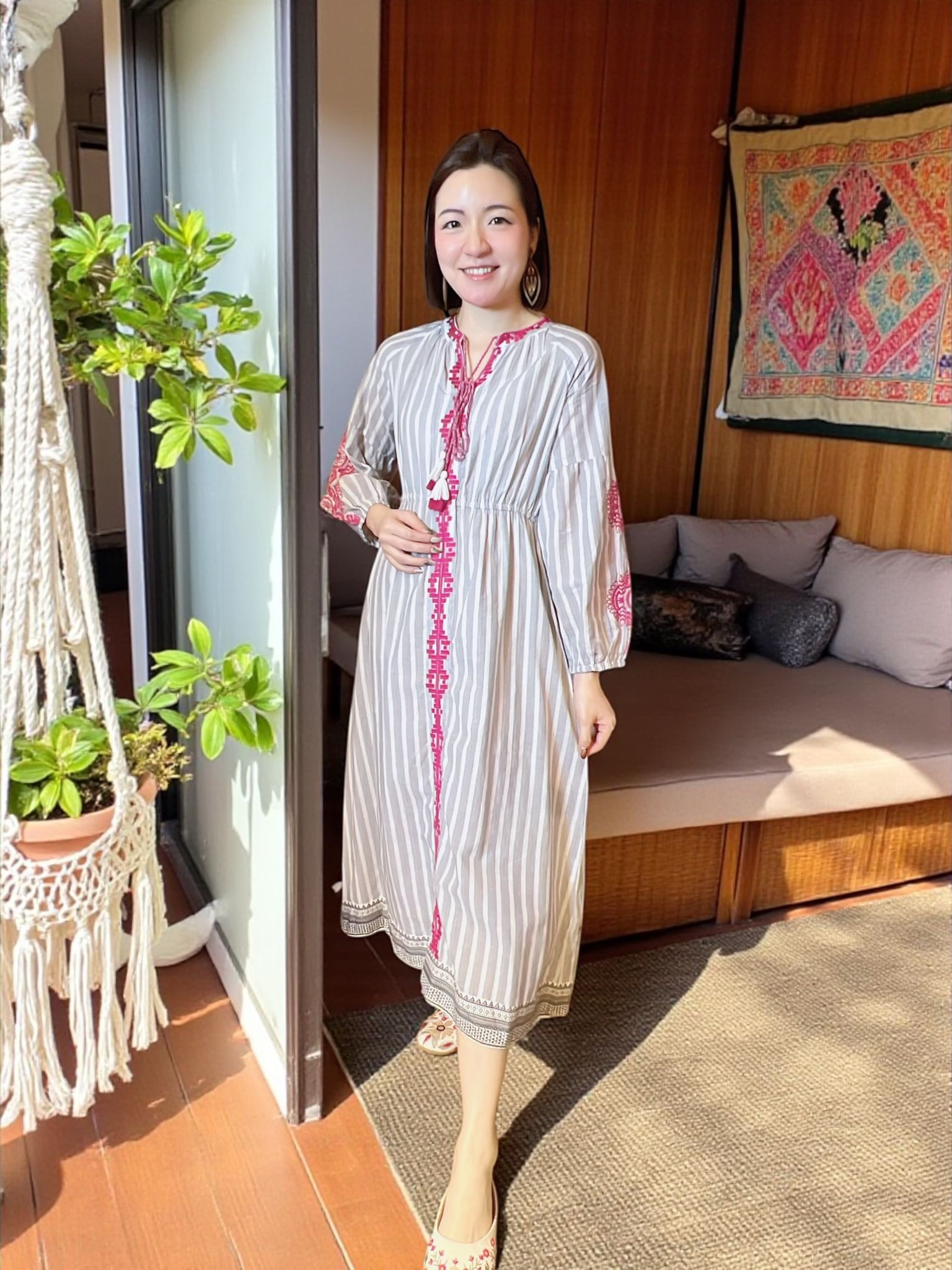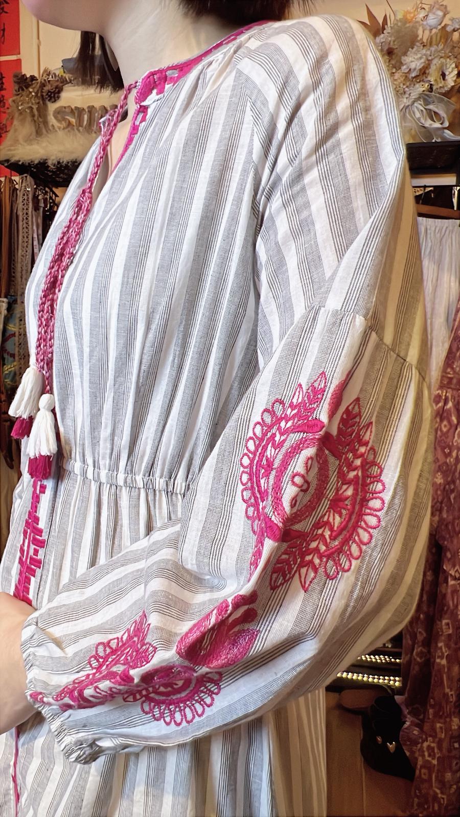 粉灰色V領直紋配桃紅色刺繡長袖連身裙