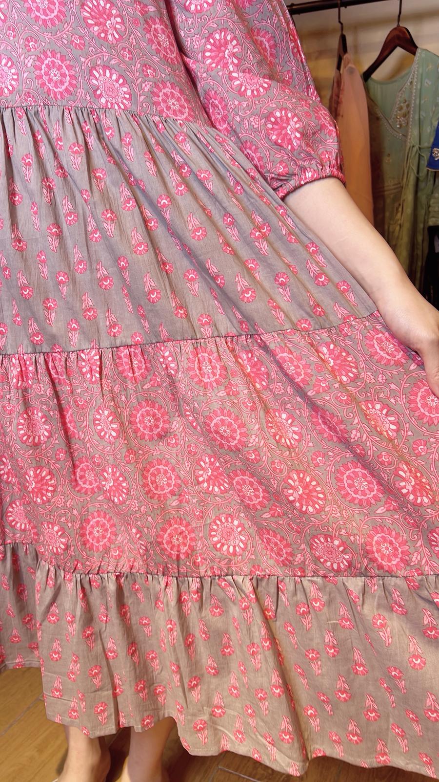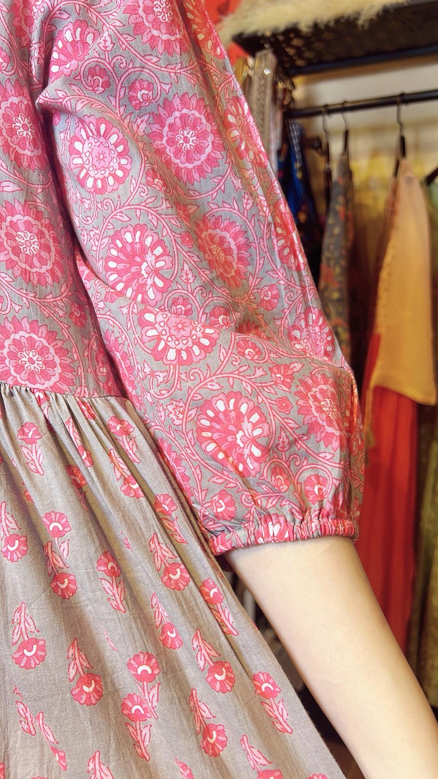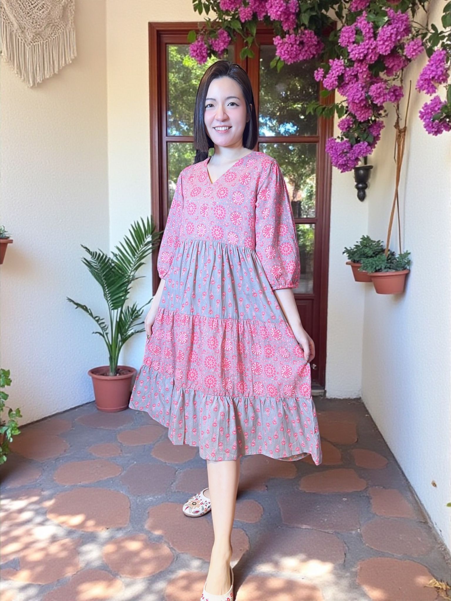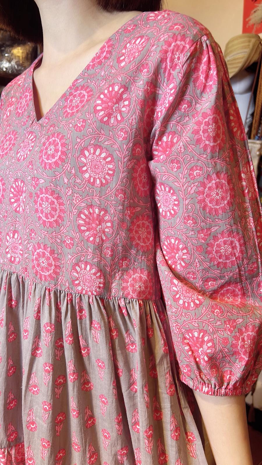 粉灰色V領Block Print印花併布中袖短版連身裙