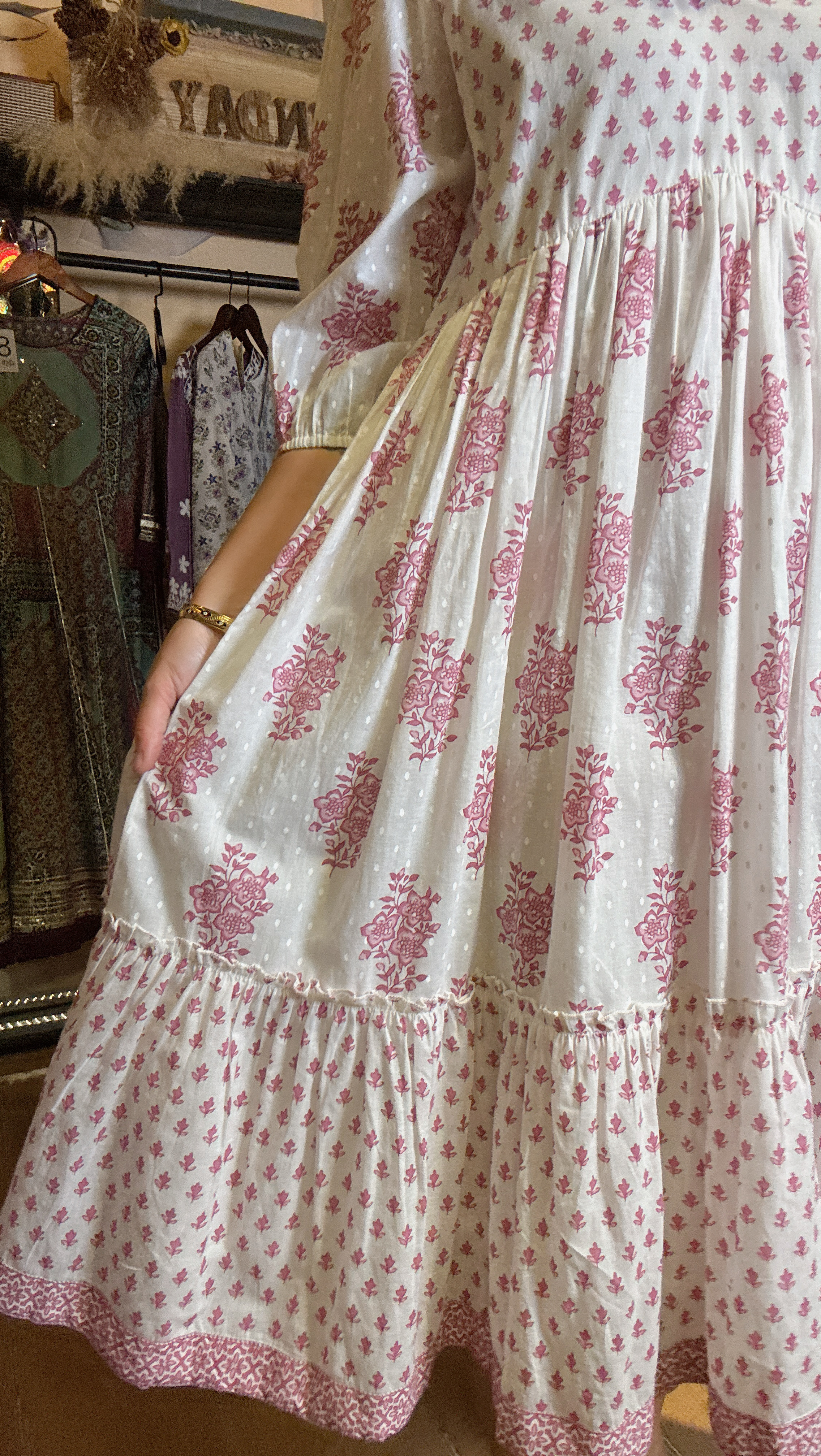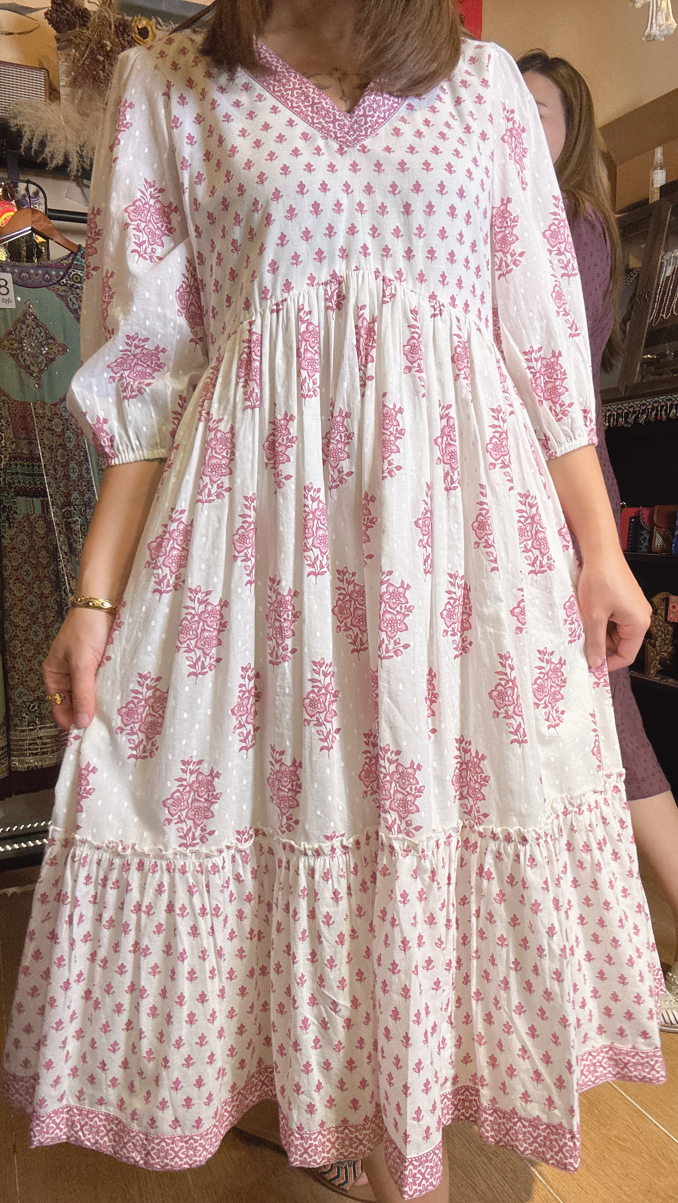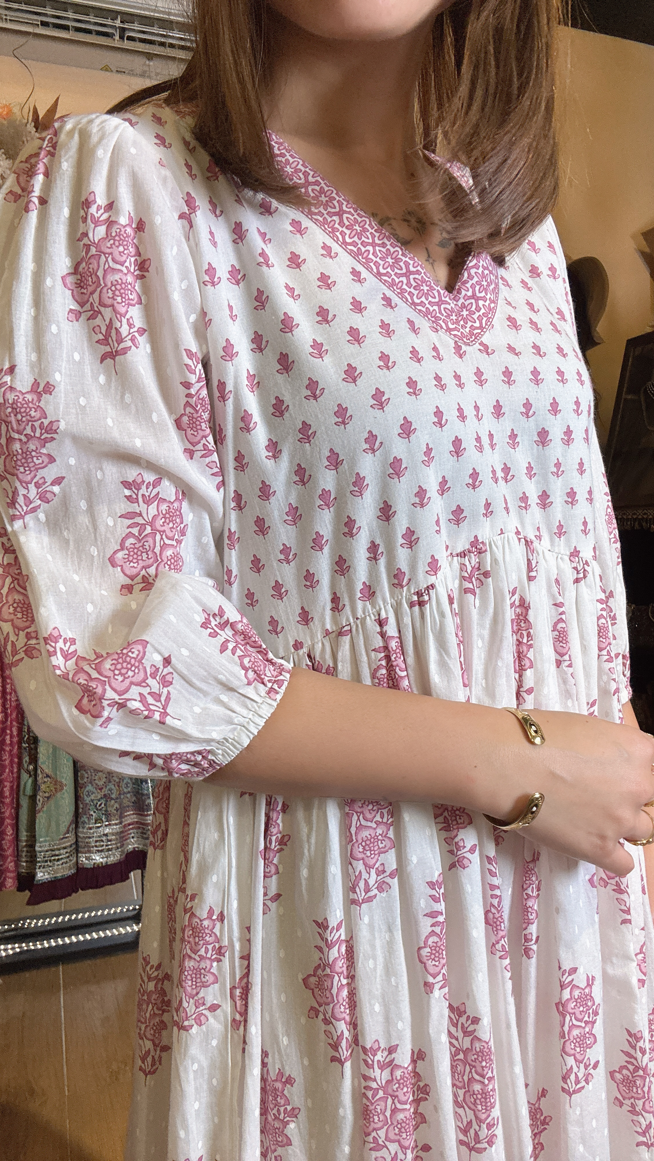 粉紅白色V領Block Print印花拼布中袖連身裙