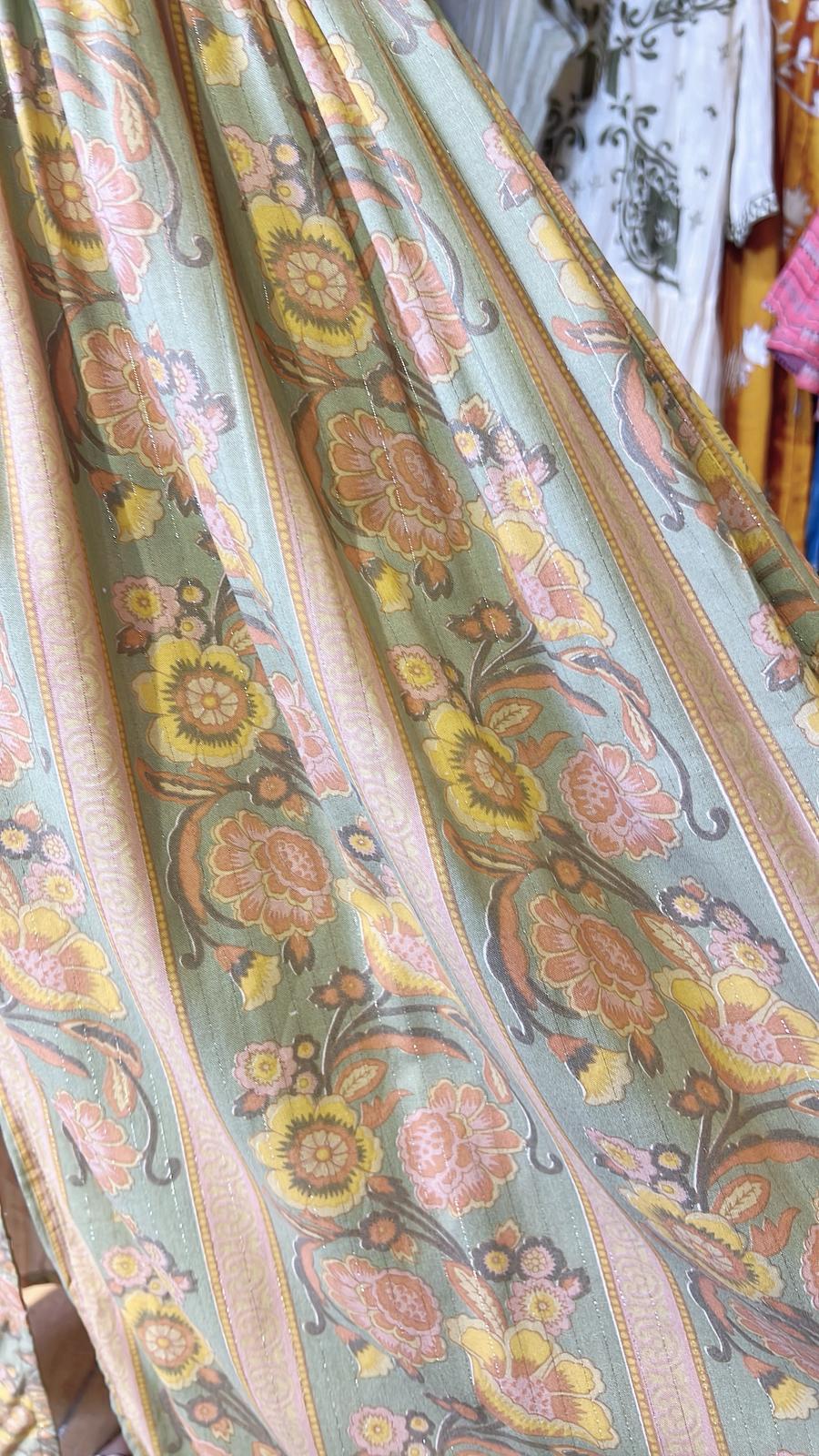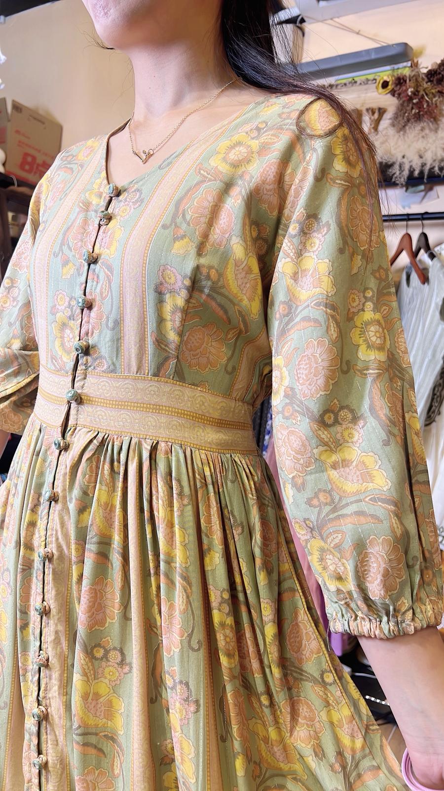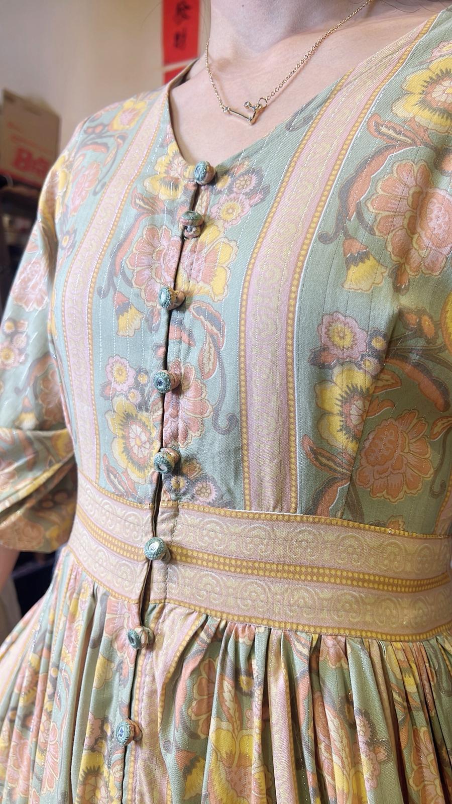 粉綠色圓領復古風印花小開叉中袖連身裙
