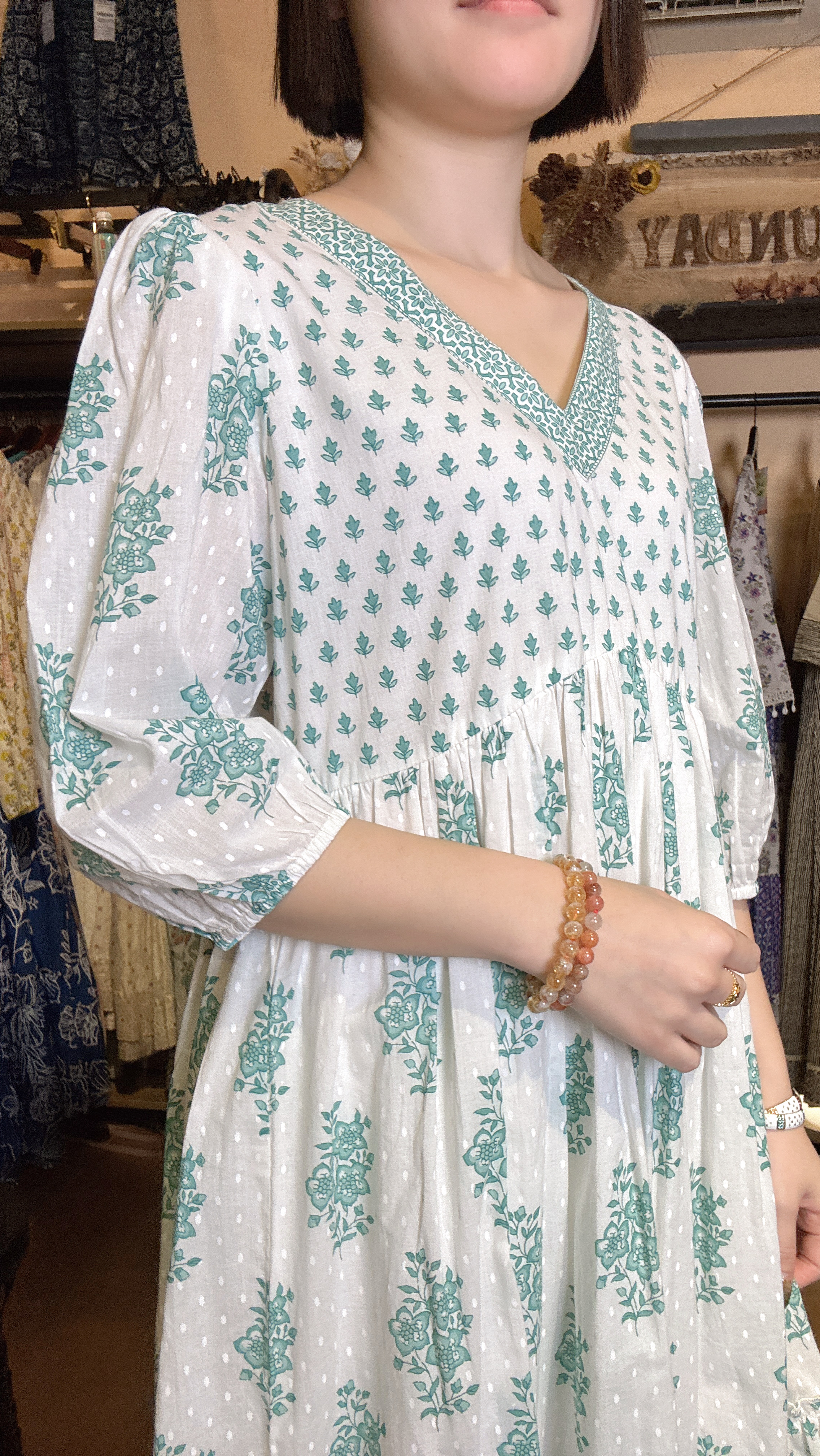 綠白色V領Block Print印花拼布中袖連身裙