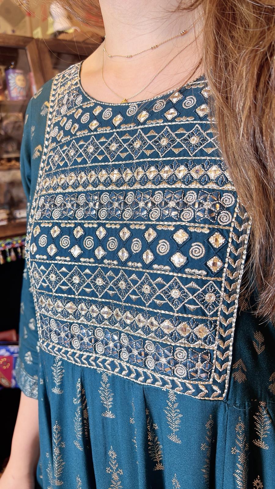 綠色圓領重工刺繡U型露背燙金中袖連身裙
