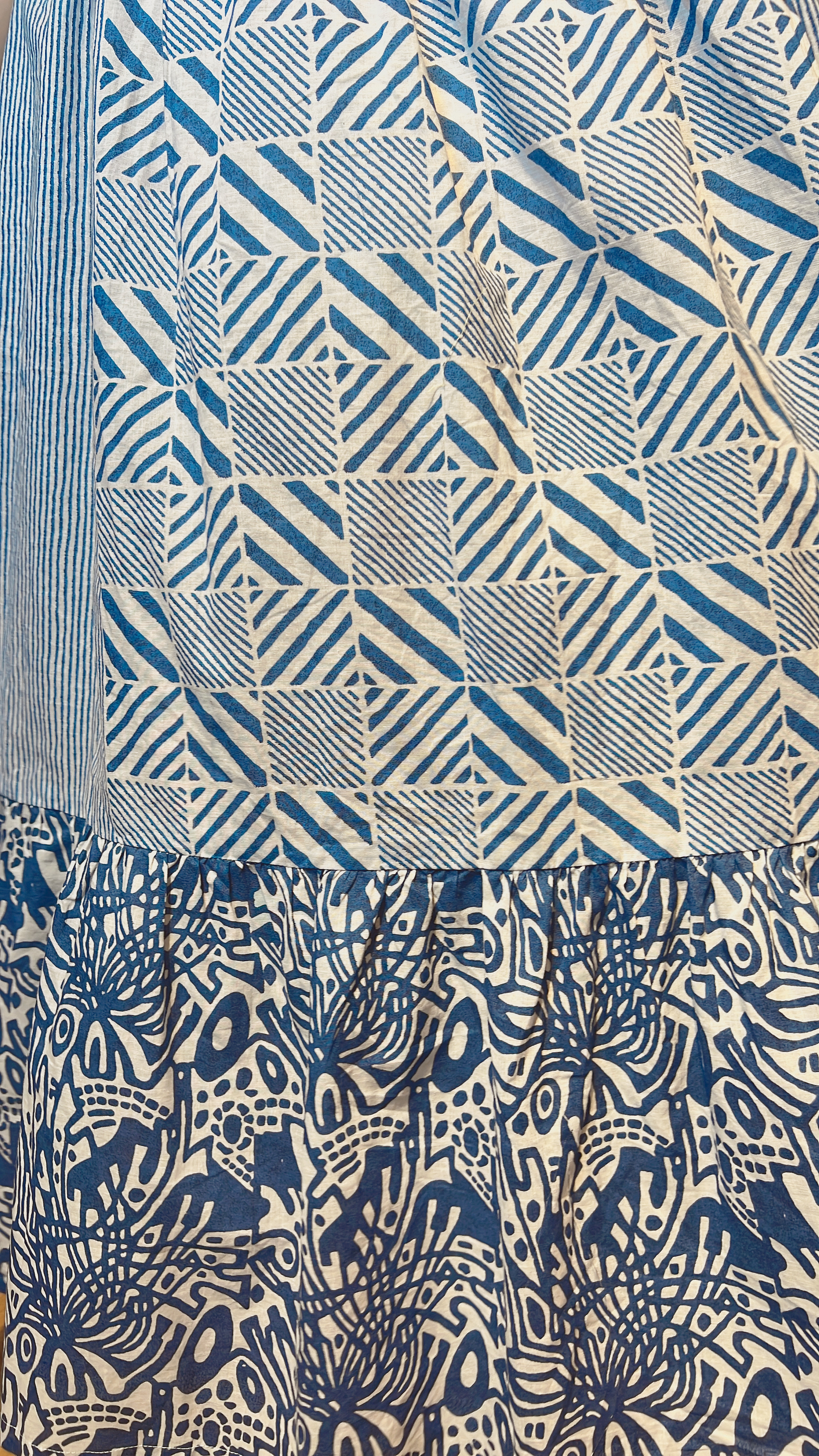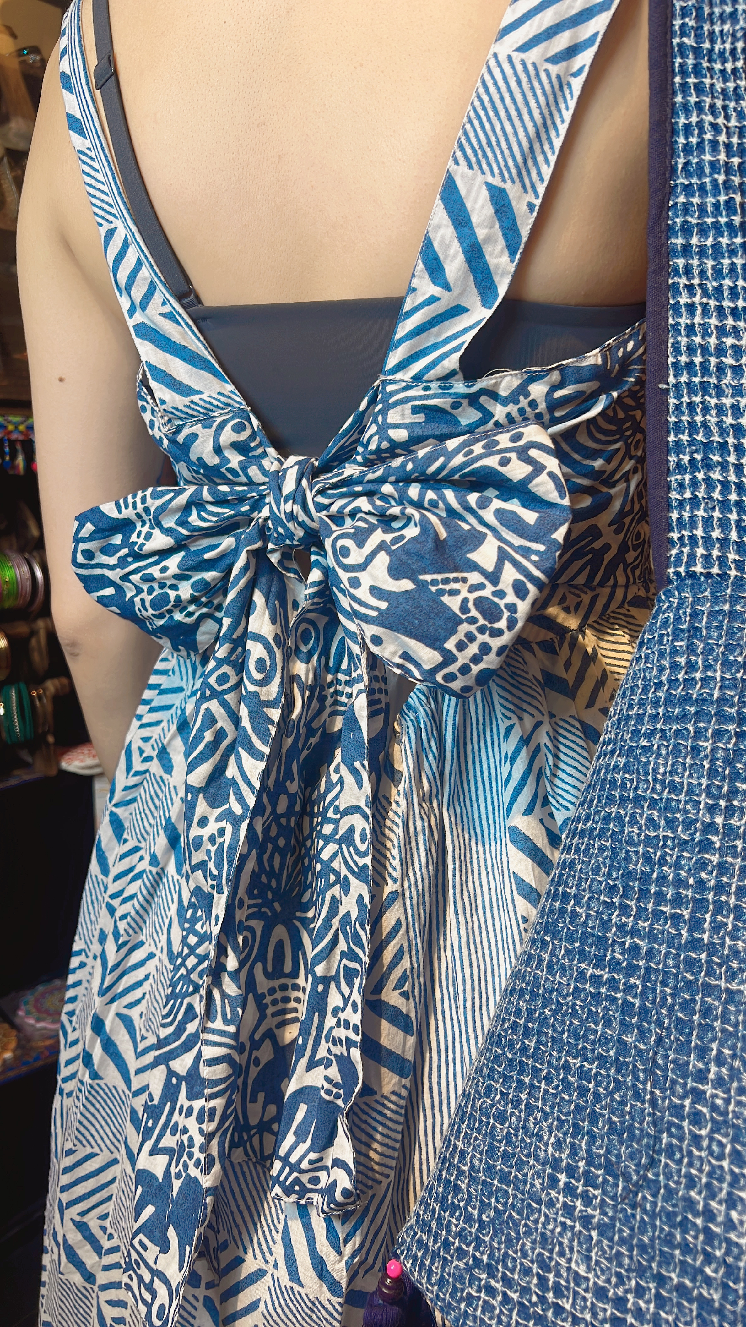 藍白色幾何圖案假兩件併布露背吊帶連身裙