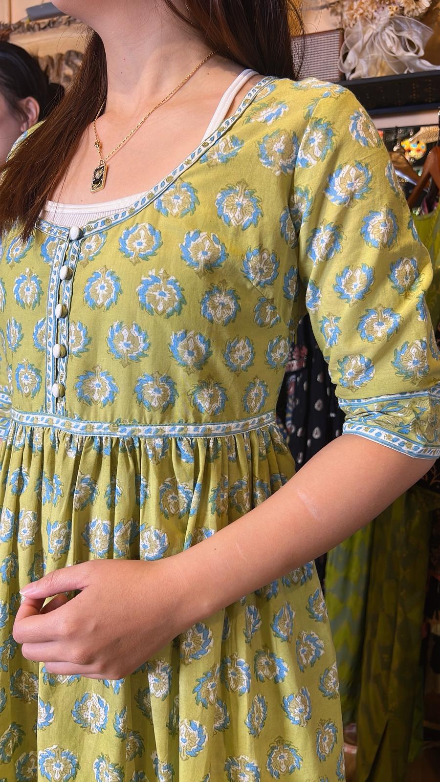 蘋果綠色圓領U型露背Block Print印花中袖連身裙