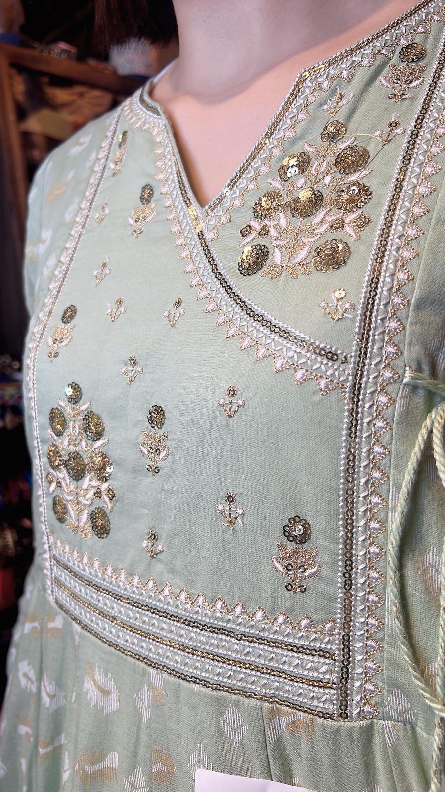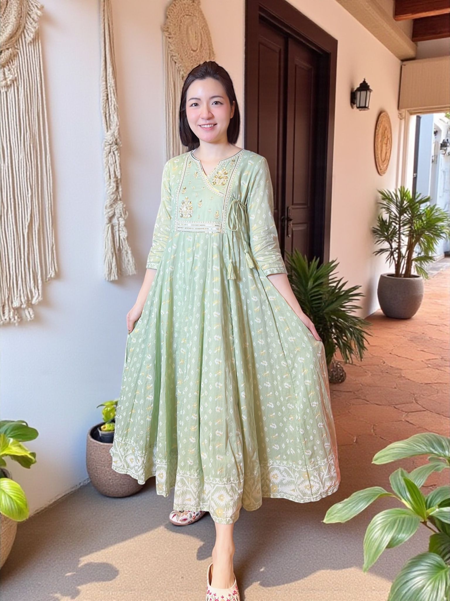 蘋果綠色小V領燙金刺繡中袖連身裙