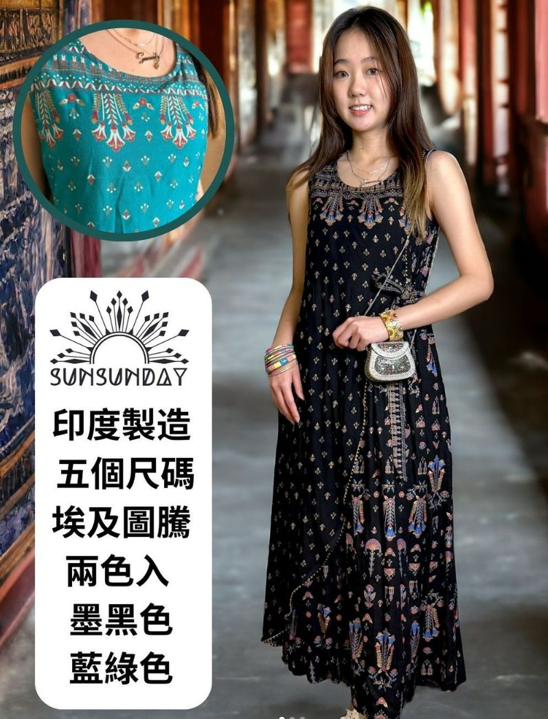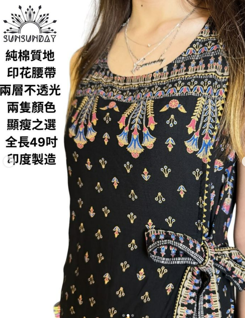 🥻埃及圖騰印花 🧚🏻‍♀️兩層設計背心連身裙 ❤️兩隻顏色🖤午夜黑🌳墨綠色 ❤️100%純棉質地 ❤️印度燙金技術☺️不脫色不易縐 ❤️兩層設計不透光 ❤️絕美圖騰印花腰帶修腰設計 🛑印度製造。五個尺碼 🛑Model 165 cm