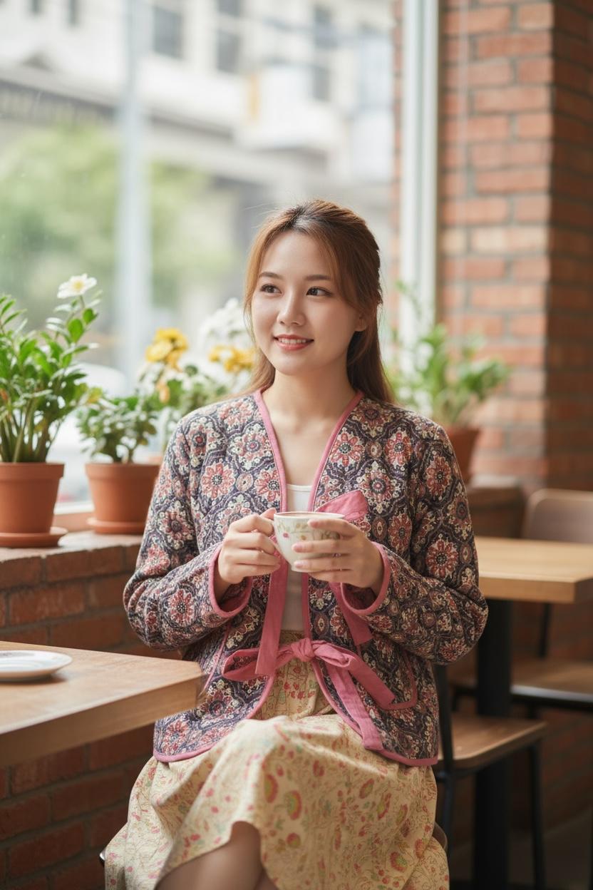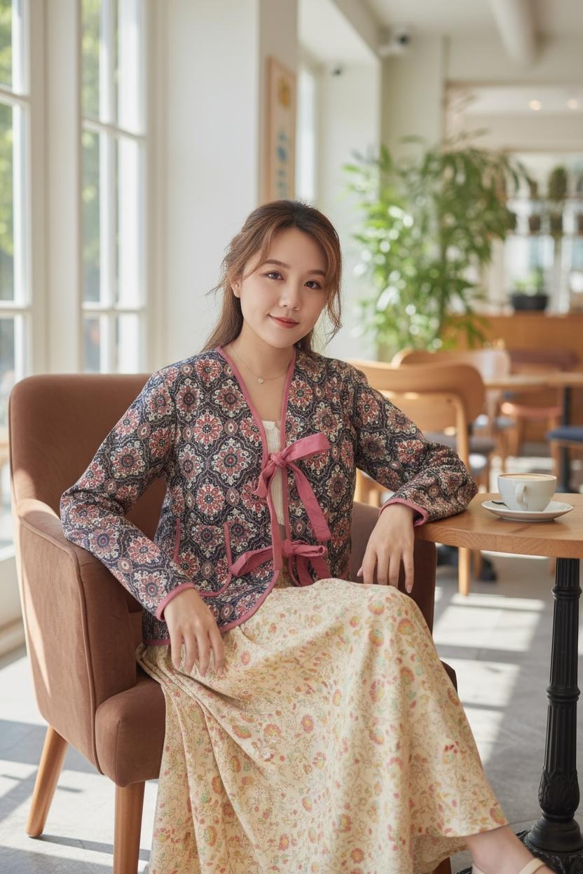黑色底印度曼陀羅配粉紅色蝴蝶結外套