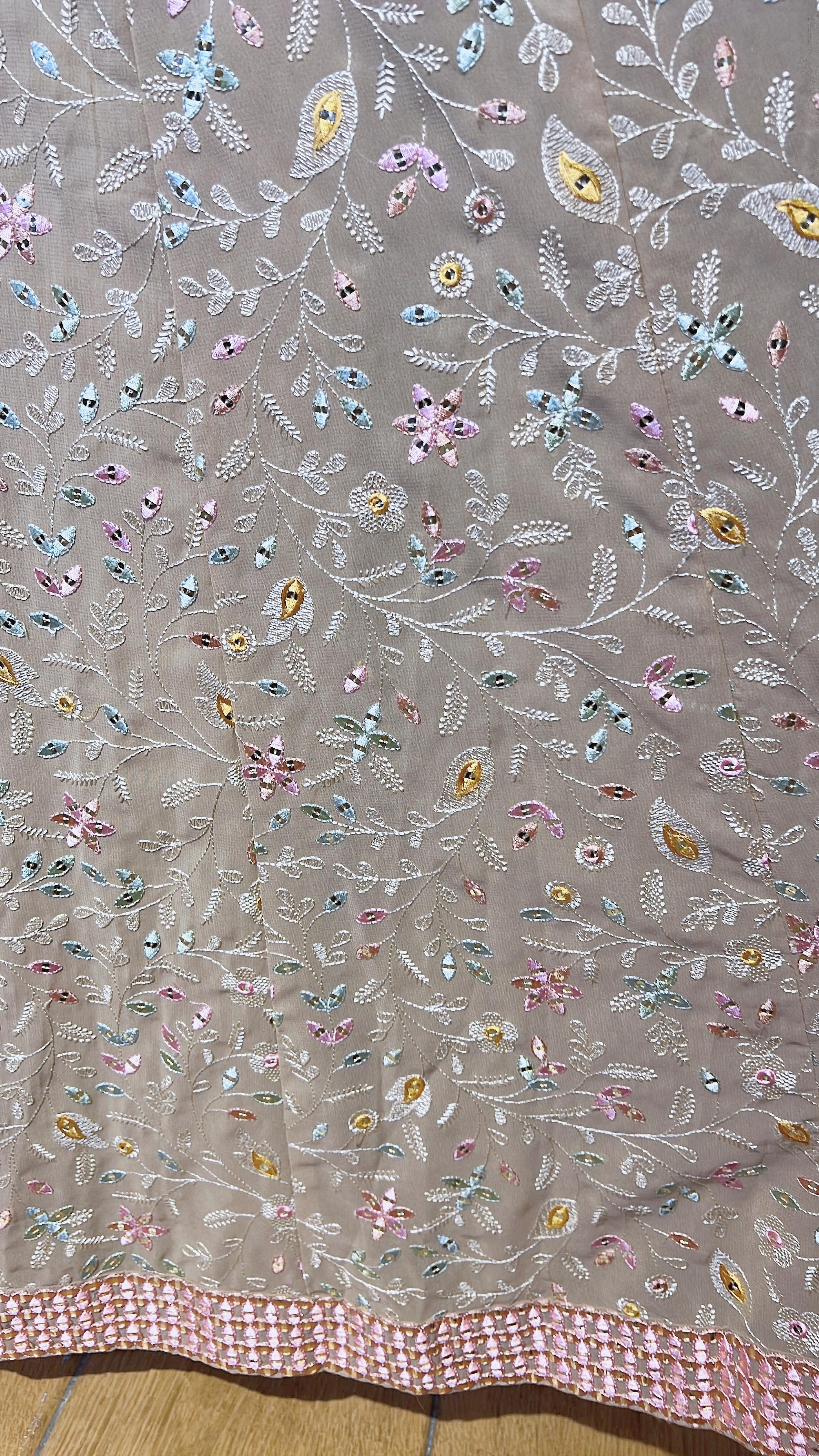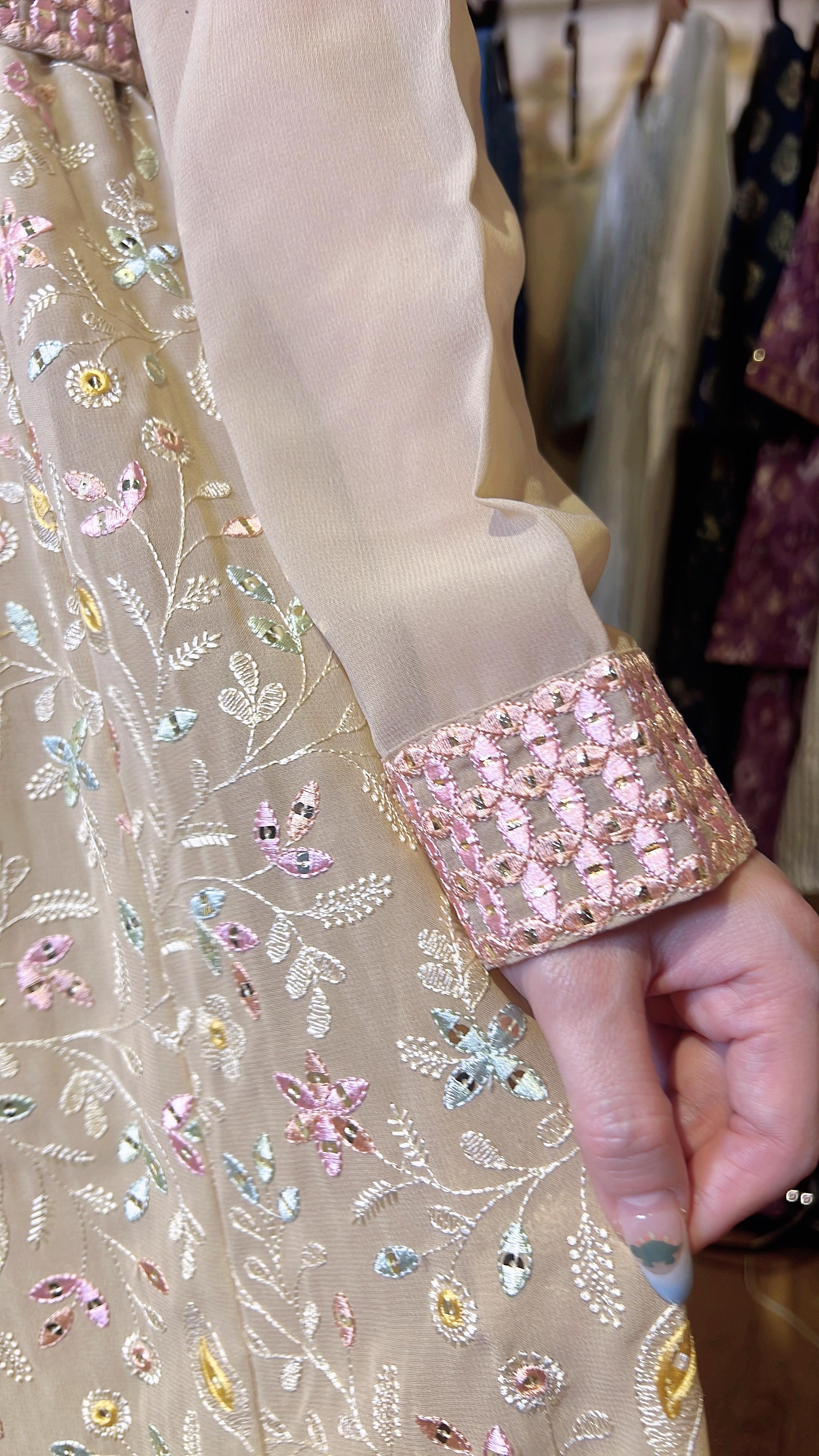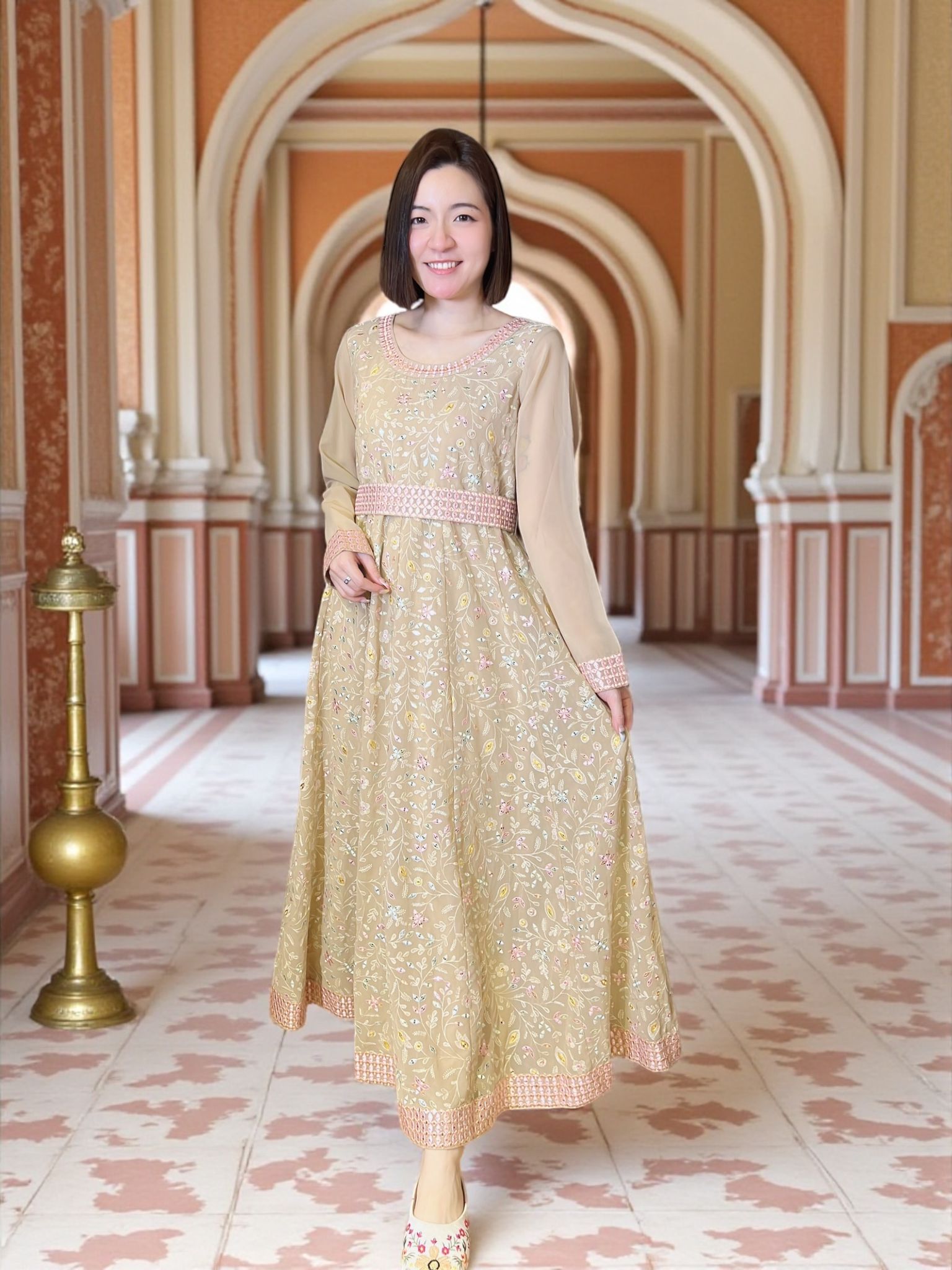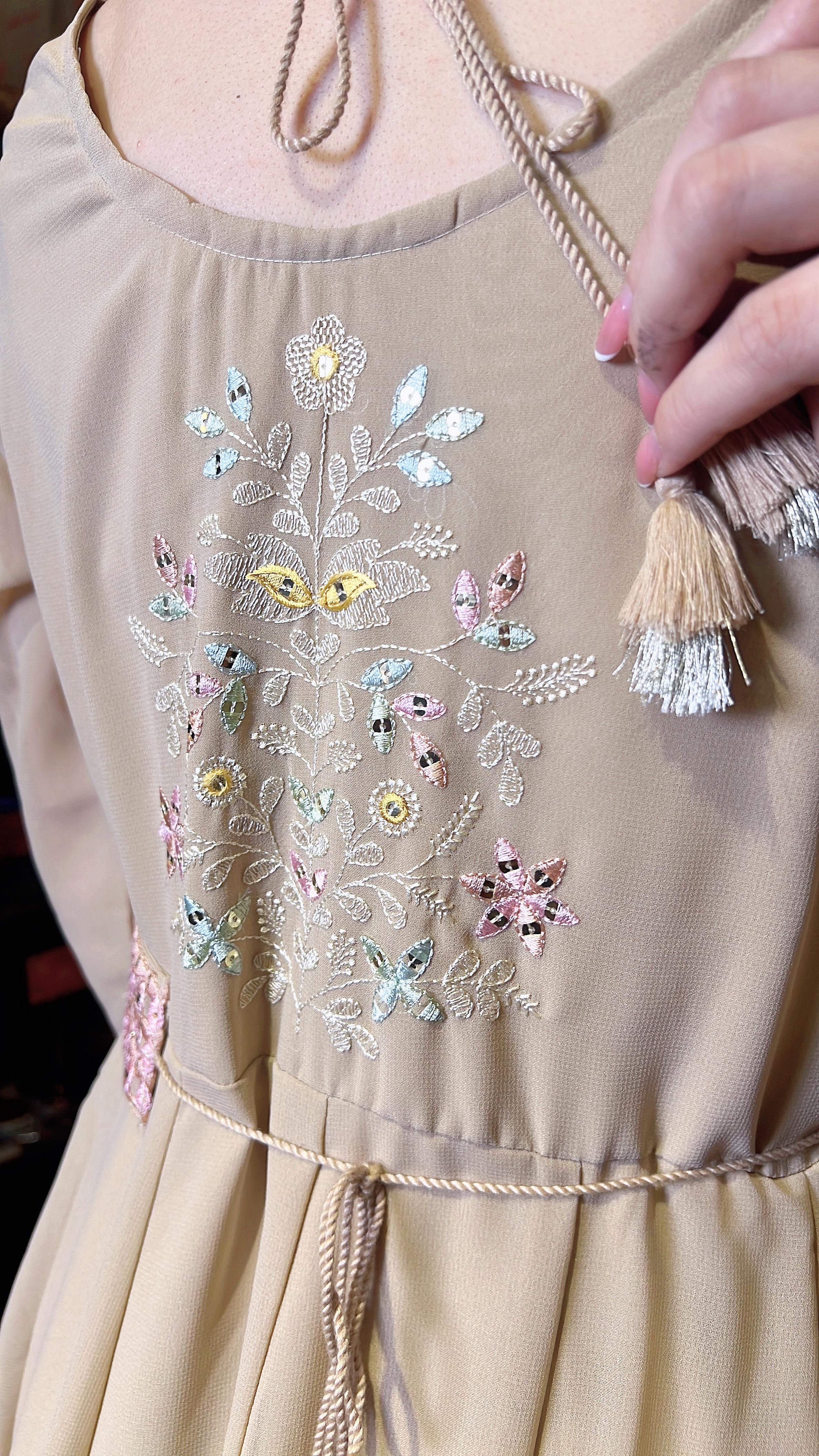 奶茶色圓領重工刺繡花連刺繡腰帶長袖雪紡連身裙