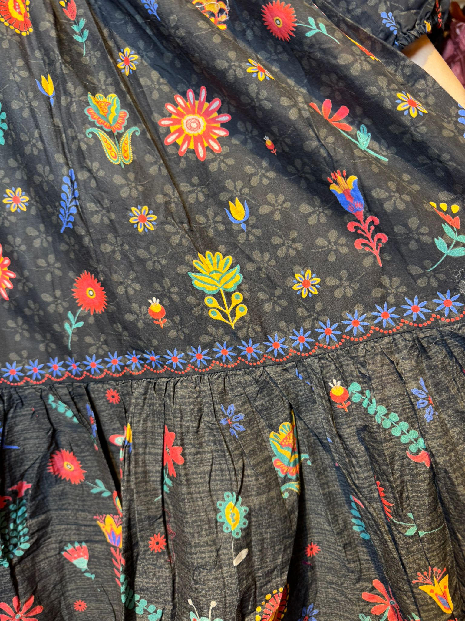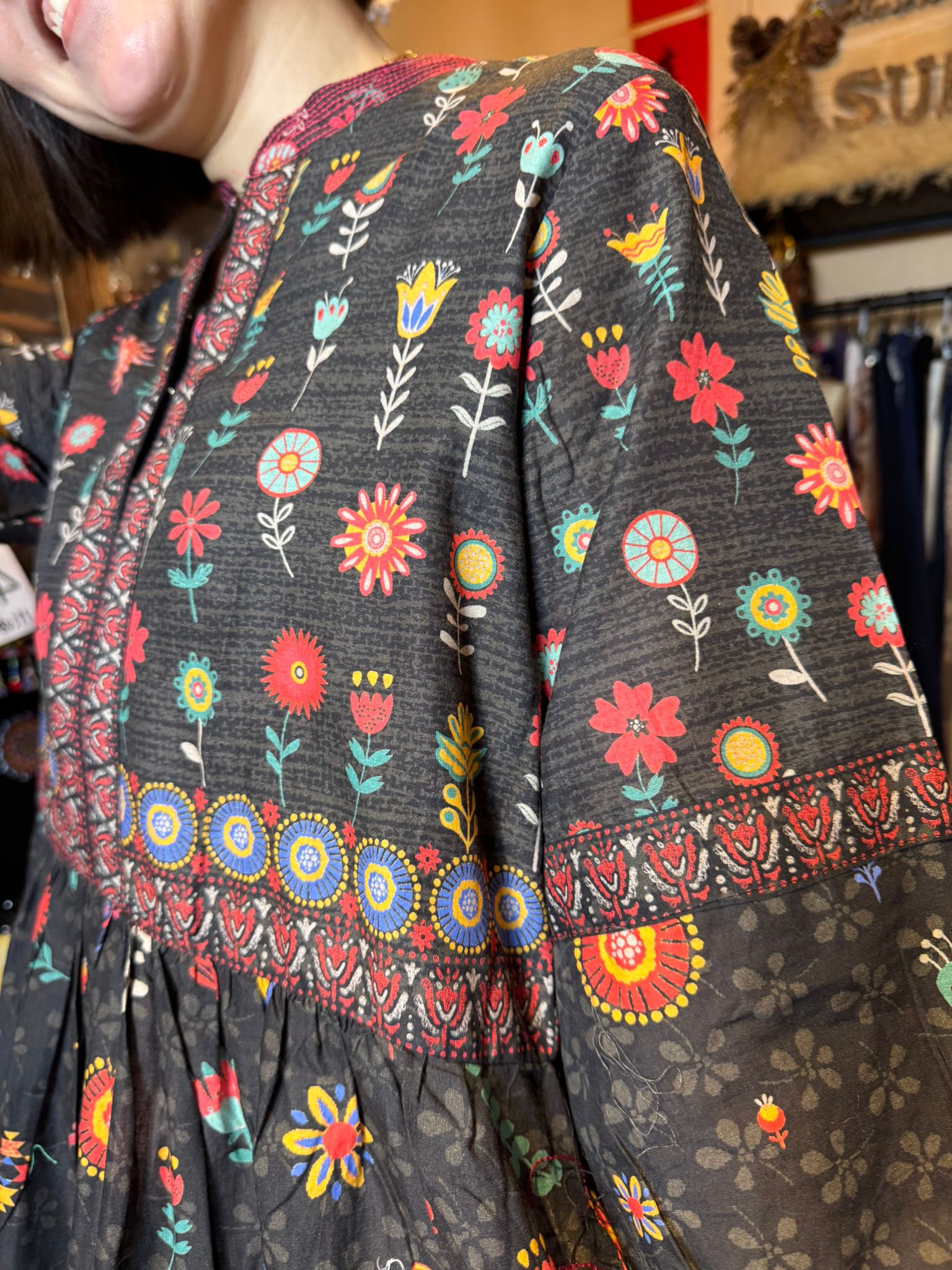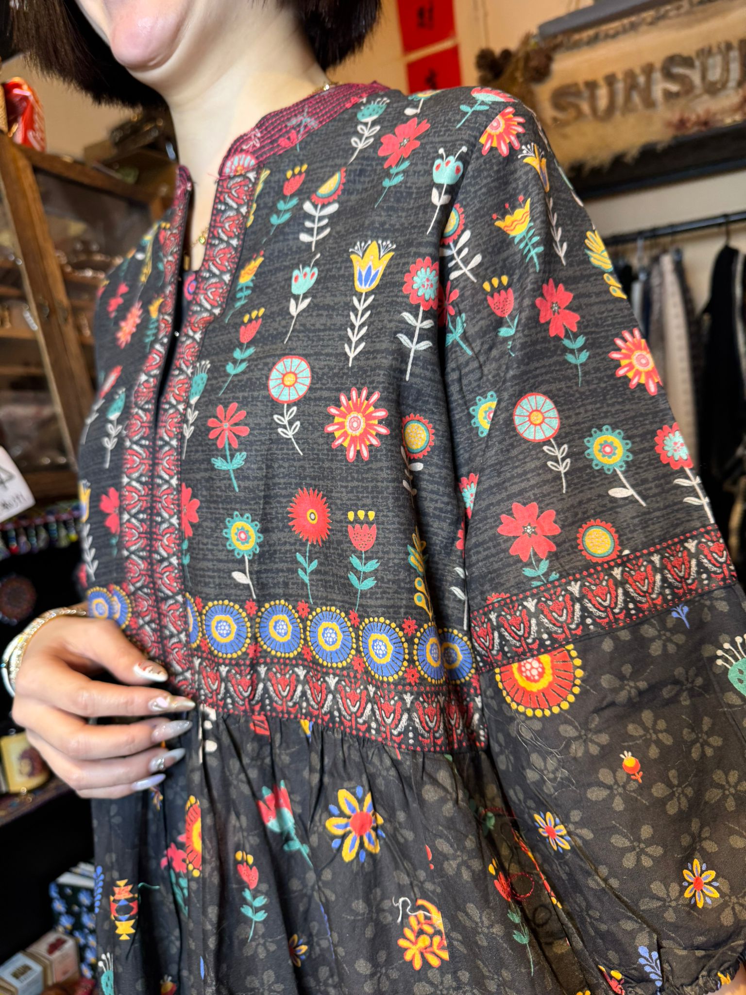 灰黑色小V領刺繡彩色印花中袖連身裙